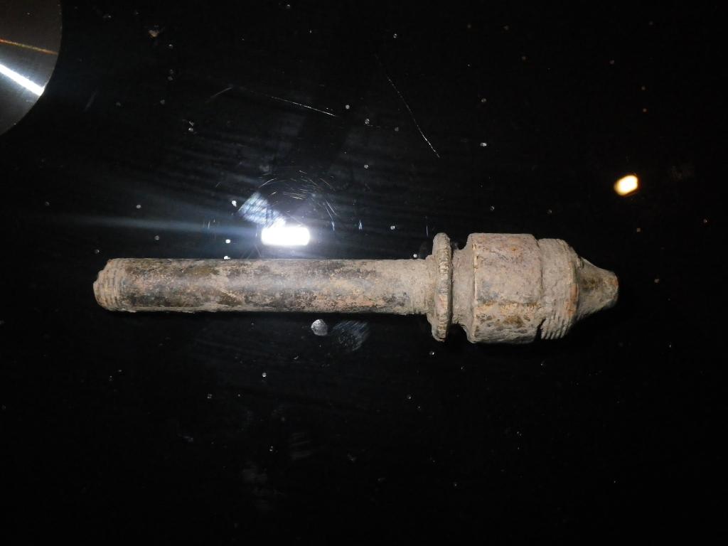Sprührohr einer alten Farbpistole, linke Seite Einschraubgewinde für Aufnahme des Druckluftverteilers, rechte Seite Einstelldüse für Farbmenge mit Feststellring.