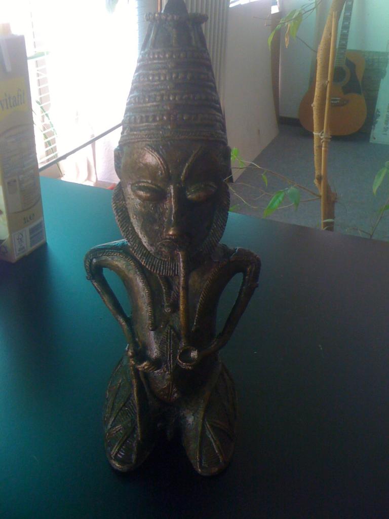 Die Figur scheint tatsächlich Yoruba-Kunst zu sein. Die dürren Ärmchen, die mandelförmigen Augen und die hochaufschießende "Krone" sind häufiger dort anzutreffende Formen.Kommentar