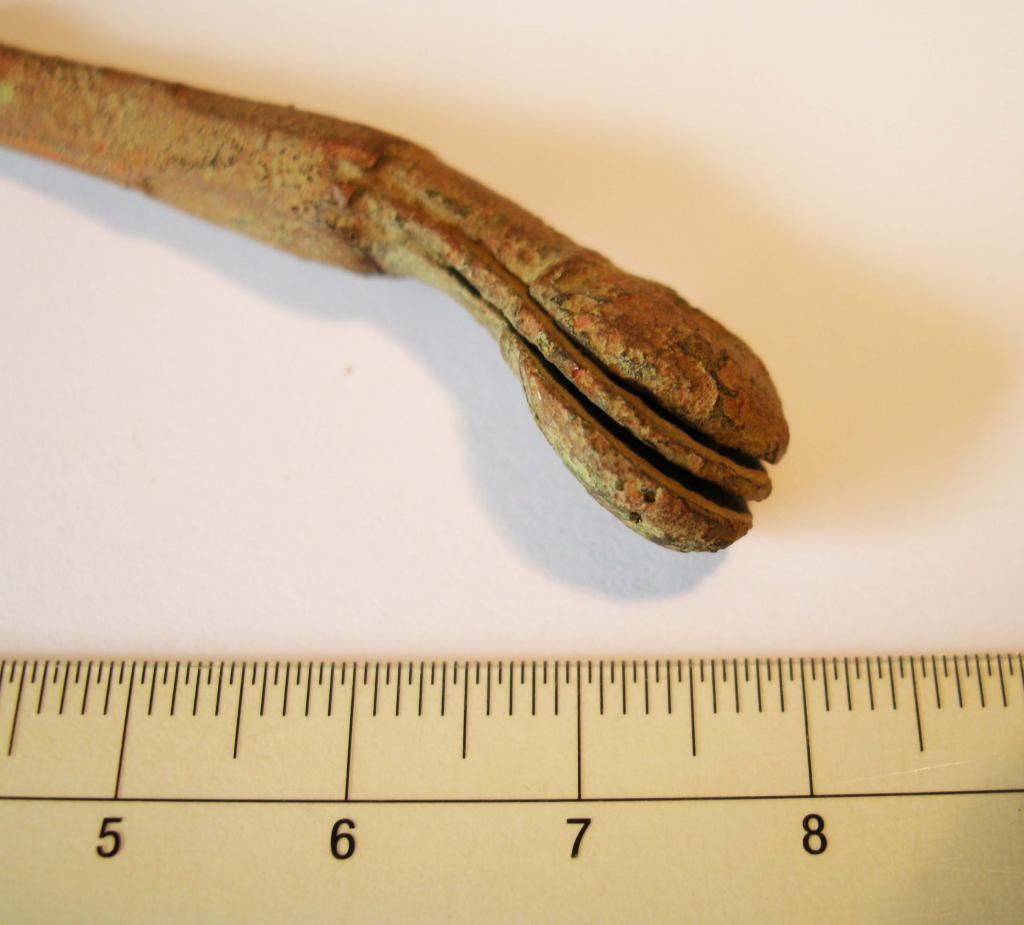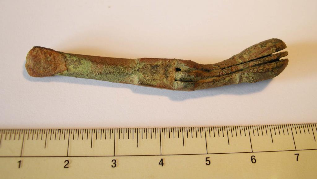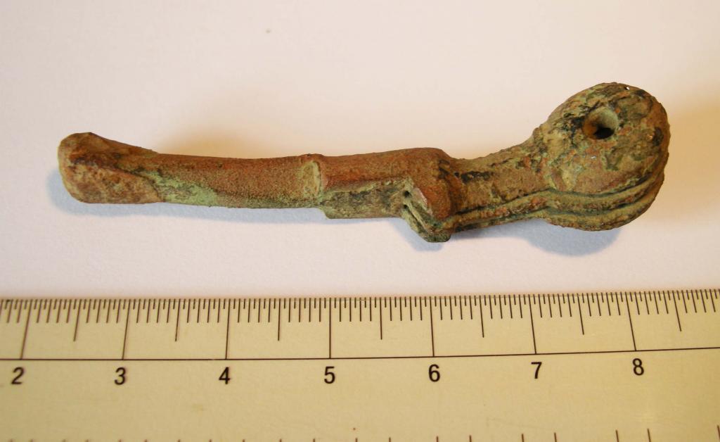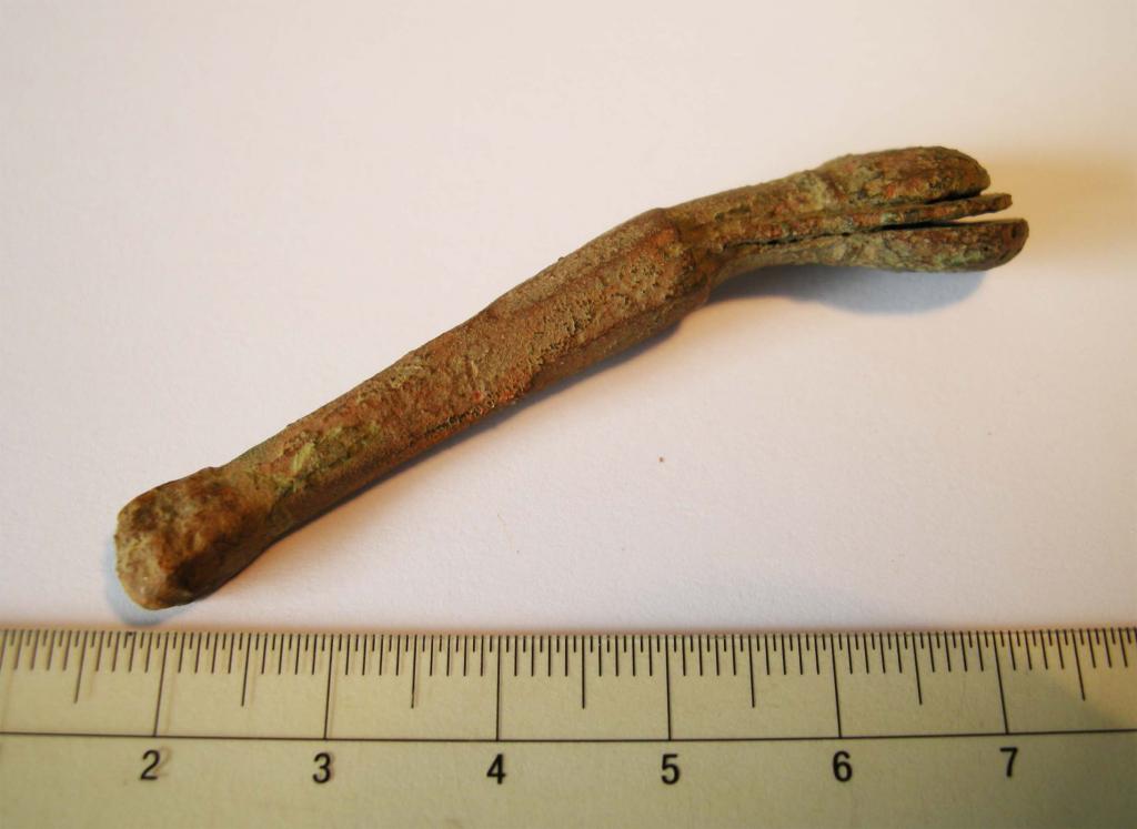 Heute habe ich dieses seltsame Fragment ausgegraben. Material ist Bronze oder Messing.