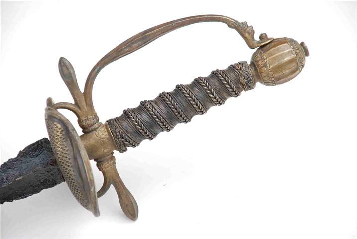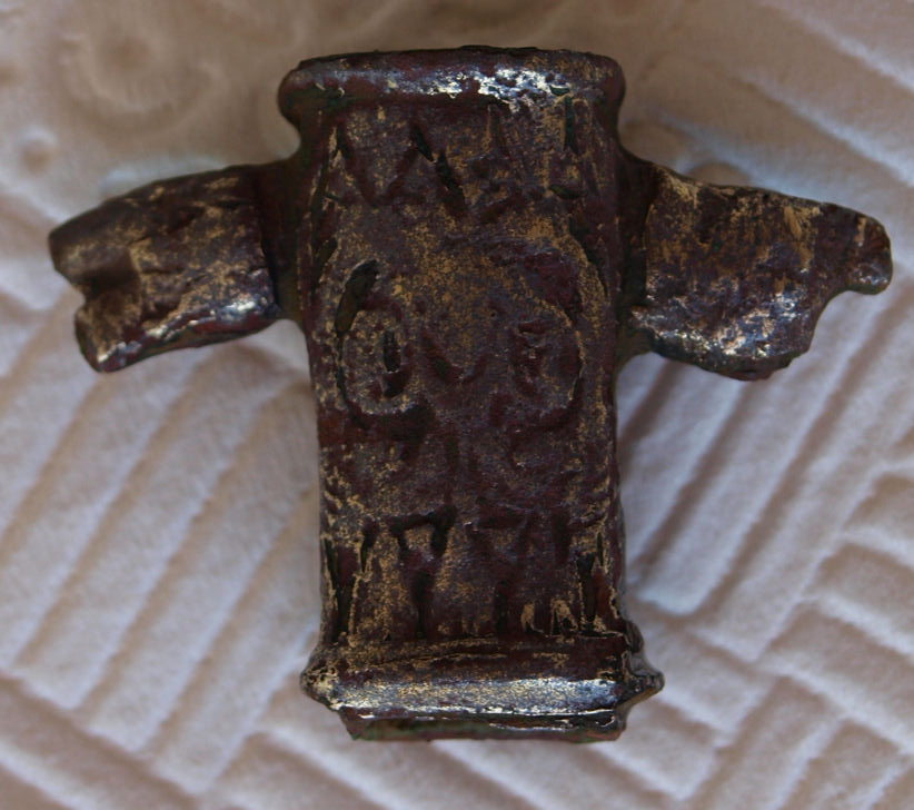 Das Material ist Bronze, es gibt keine Eisenrückstände, Beifund war ein kleines Beschlagteil mit einem Jakobs-Muschelmotiv.