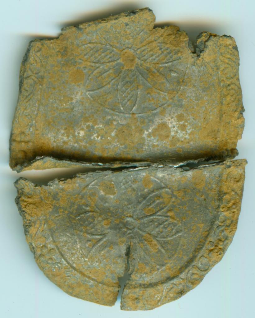 Bild 1+2: Bleiplakette mit Blümchen drauf. 43,82 x 33,64; 1,01; 6,09 Wozu wurde die verwendet? Wie alt?