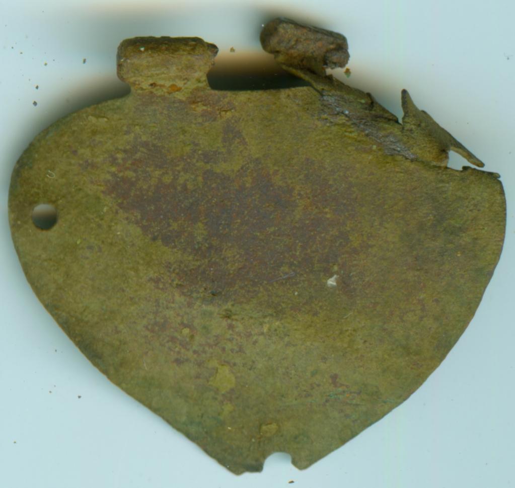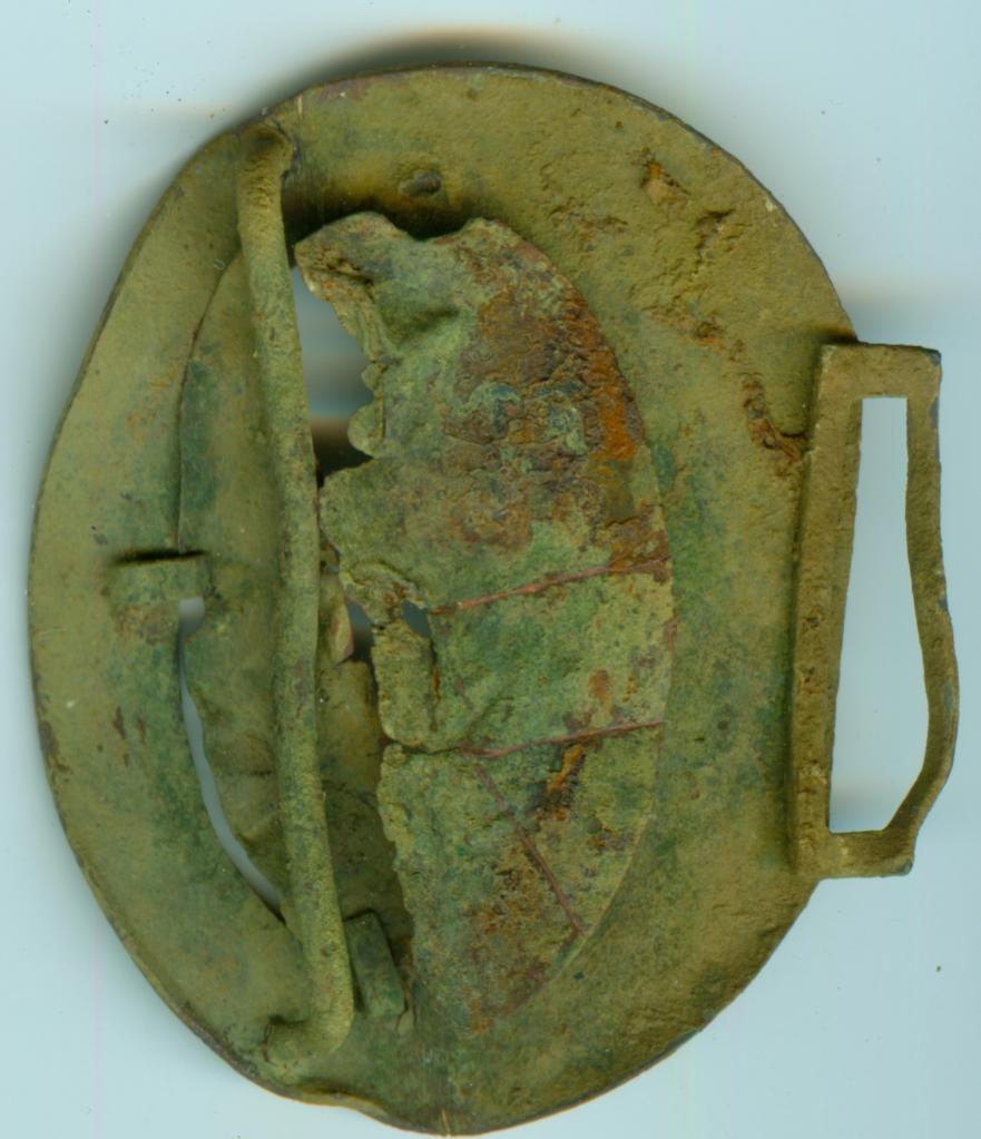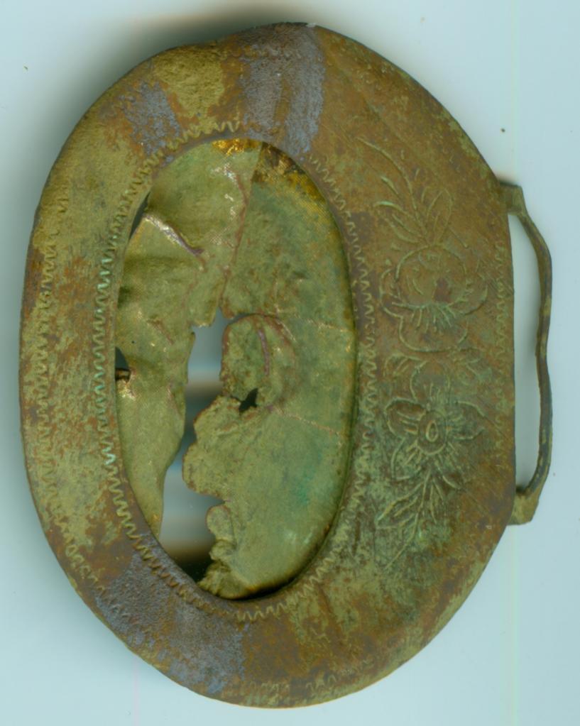 Bild 5+6: Schnalle? Beschlag? 50,50 x 42,4; 5,84; 8,78 In dem Loch in der Mitte ist ein Messingblech eingelegt, auf dem ich allerdings auch keine Gravur finden konnte. Allerdings sind auf dem Rahmen ein paar schöne Blümchen eingraviert. Watt 'n datt? Und vor allem, Wie alt?
