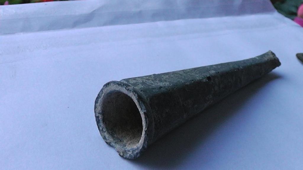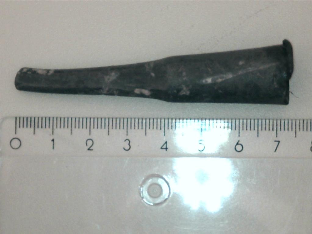 Sieht mir schon aus wie eine Geschoßspitze. Das sieht aus wie Hiebspuren auf der einen Kante. Innen ist kein Gewinde oder ?