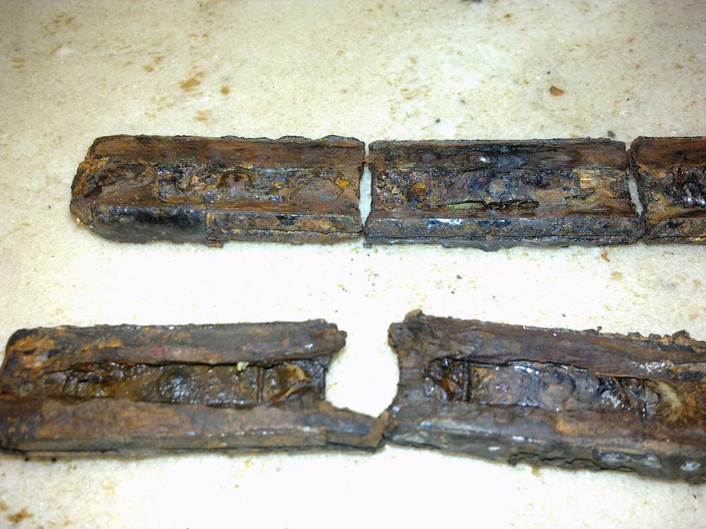 Hey Leute. War heute mal bei mir im Wald sondeln. Nach einem 2 Reichspfennig Stück von 1874 und einigen alten Getränkedosen und Nägeln bekam ich auf einmal bei einem relativ frisch gefälltem aber ziemlich großen Baumstumpf ein schönes Signal. Nach ein bisschen graben genau zwischen 2 großen Wurzeln kam auf einmal eine Plastiktüte zum Vorschein. Nach einem Zug daran hatte ich dann die Hälfte der Tüte in der Hand und fühlte dass da was drin war... irgendwelche unbekannten Metallteile (siehe Bilder). In dem Rest der Plastiktüte kam dann eine ziemlich große, runde und sehr schwere Stahlkugel zum Vorschein. Die Stahlkugel war ja recht einfach zu identifizieren aber bei den anderen Teilen bräuchte ich Hilfe