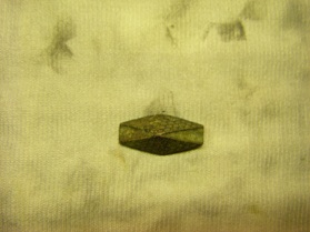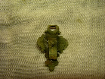 Das rautenförmige Teil ist ca. 3 cm lang, hinten hohl mit einer Öse, an der noch Fadenreste hängen.