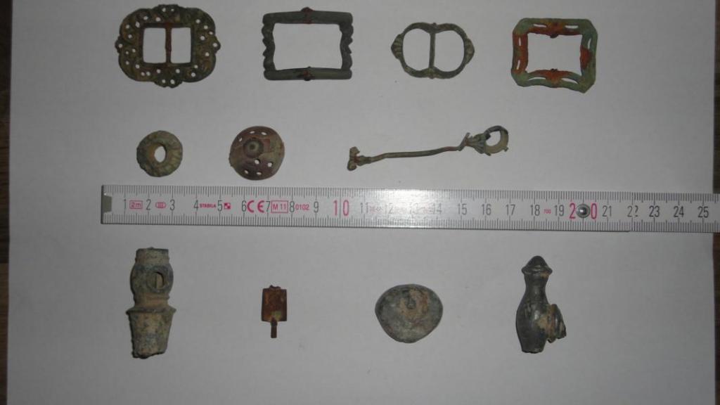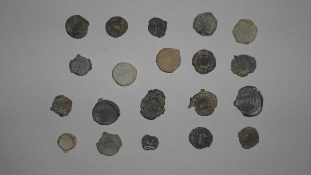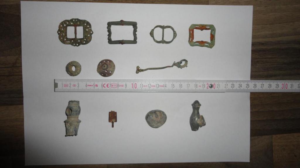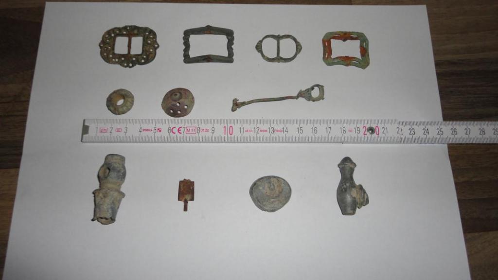 1.vielleicht ein Teil einer Pfeife, 2. Schlüssel? (auf der einen Seite ist ein Schiff auf der anderen Seite irgendein Kranz), 3. Bleisiegel?, 4. keine Ahnung, jedenfalls auch wieder aus Blei