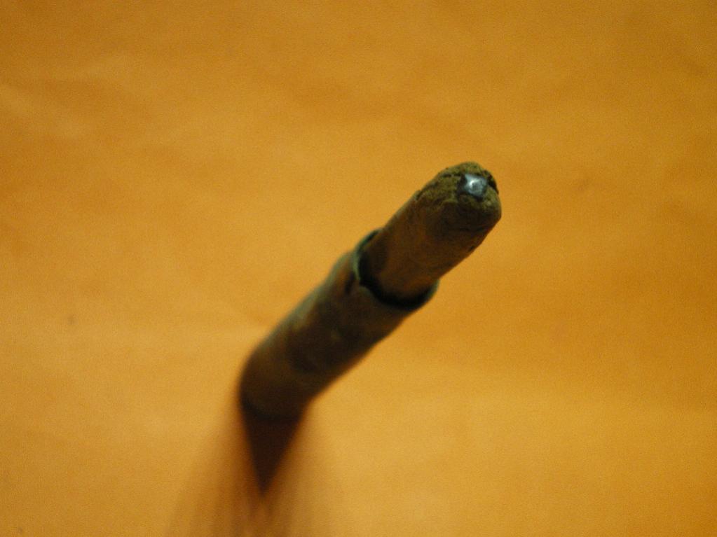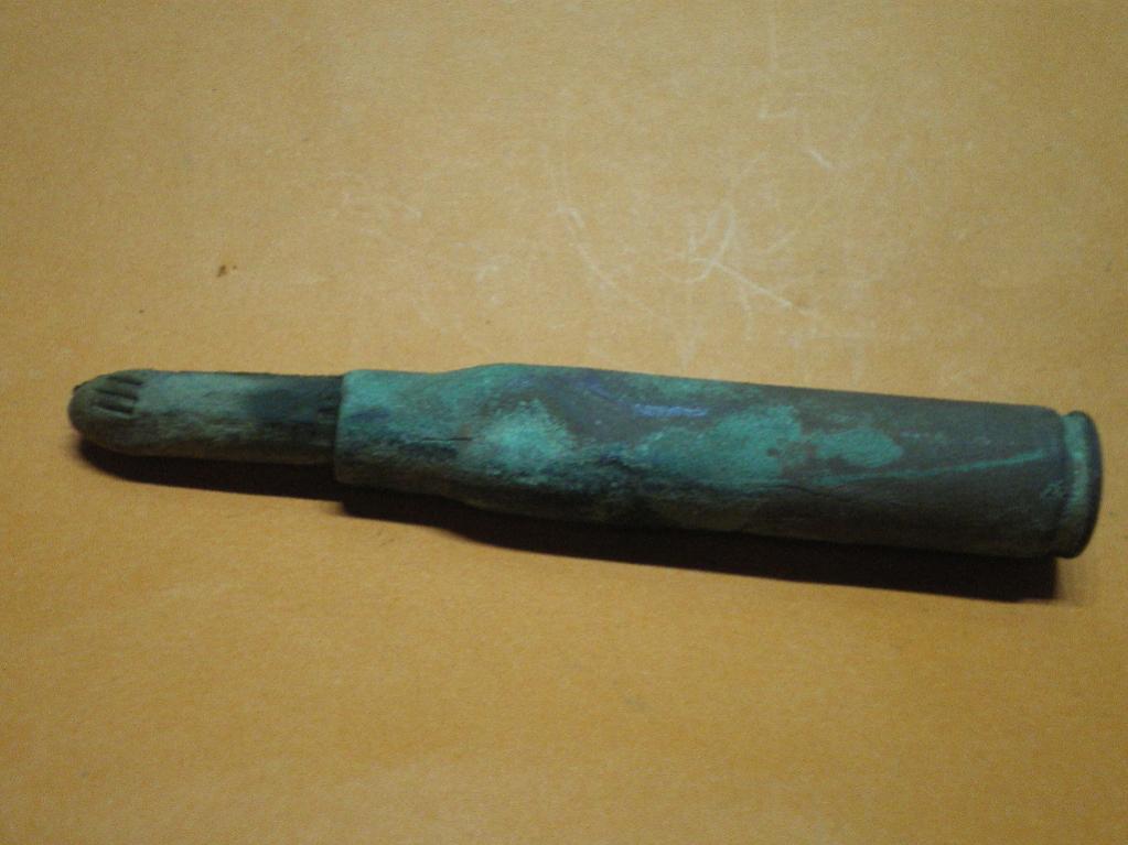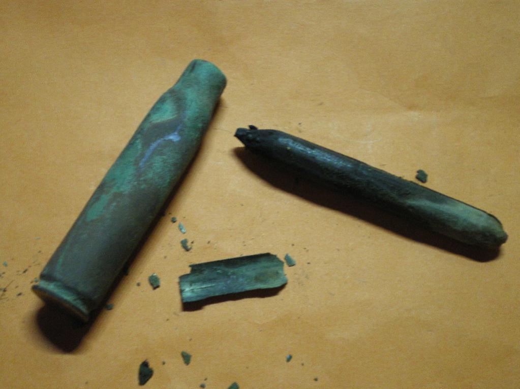 heute gefunden...ich dachte erst an eine Manöverpatrone mit Holzgeschoss,aber daheim hat es sich als Schreibgerät rausgestellt....Witzige Bastelei,oder üblicher Gebrauchsgegenstand?.... ist sogar ein kleiner,halbrunder Blechstreifen vorhanden,der die Differenz zwischen Hülse und Bleistift ausgleichen soll,und gleichzeitig den Stift hält,wenn er durch das Anspitzen kürzer wird,und demzufolge in der Hülse verschwinden würde.