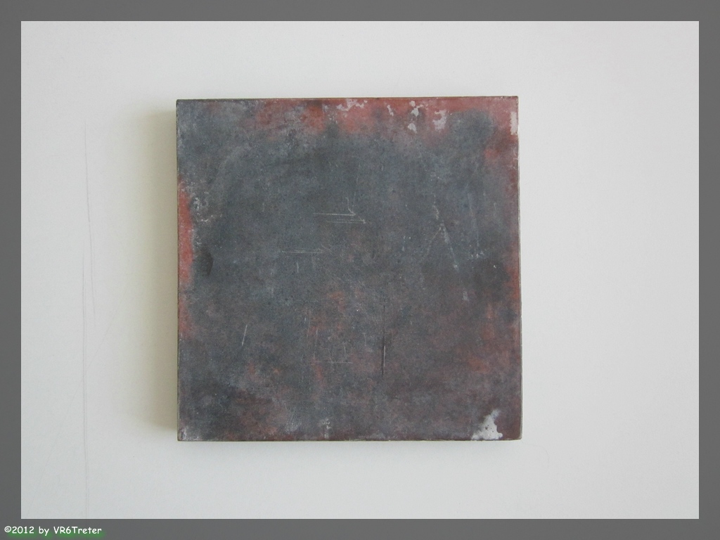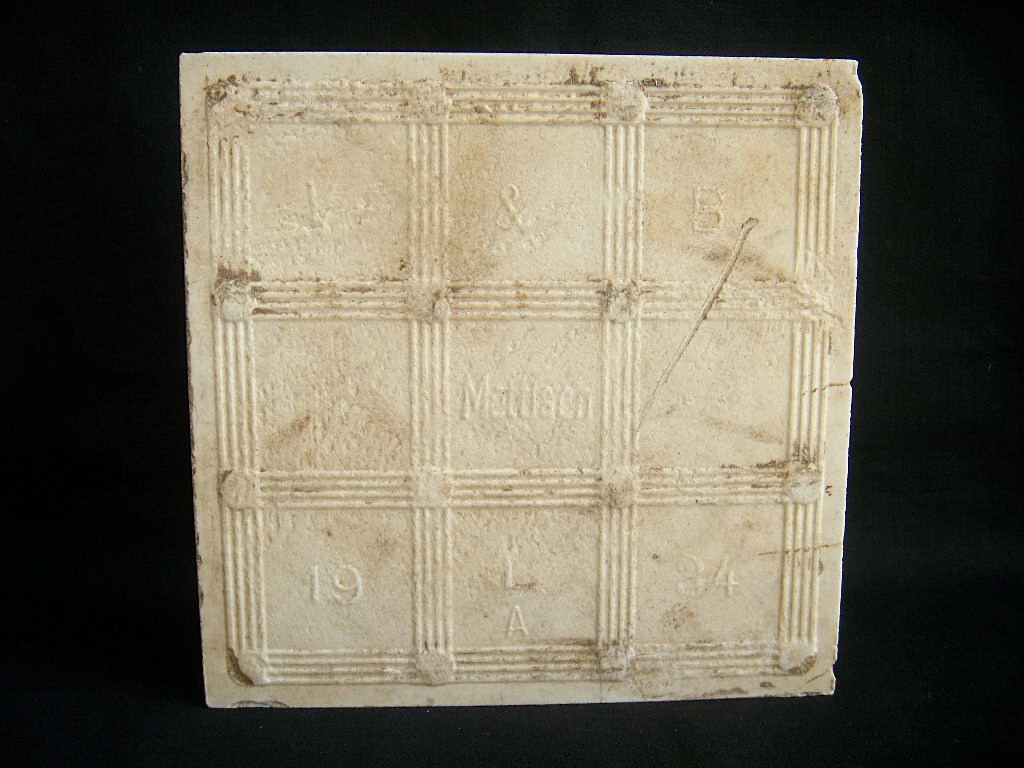 Ich habe diese Kachel von Villeroi & Boch/Mettlach geborgen.Dick,schwer und 14,8 cm x 14,8 cm groß.Datiert 1934 und Kürzel 'LA'.