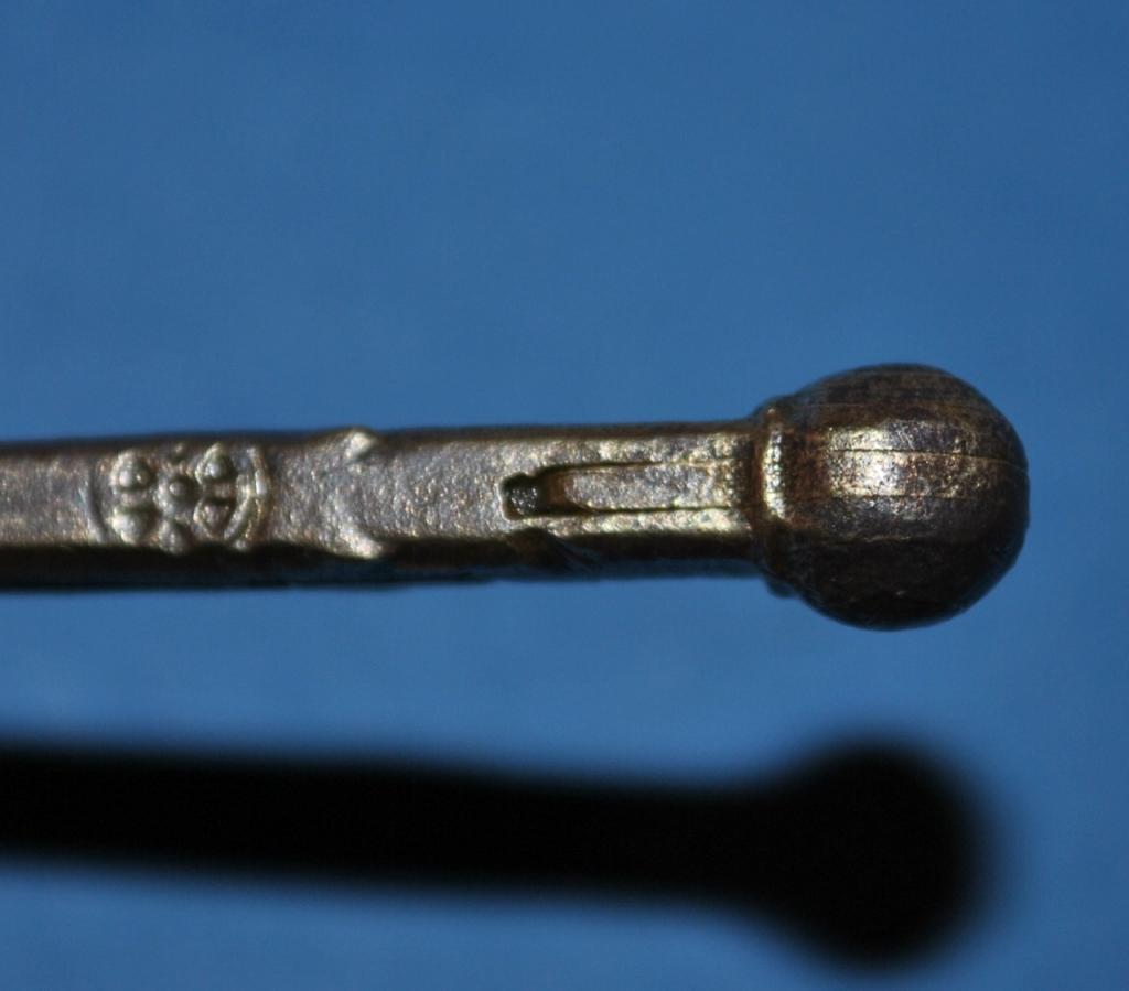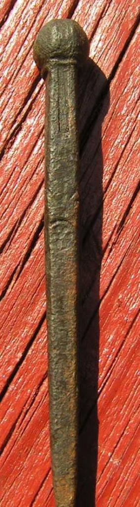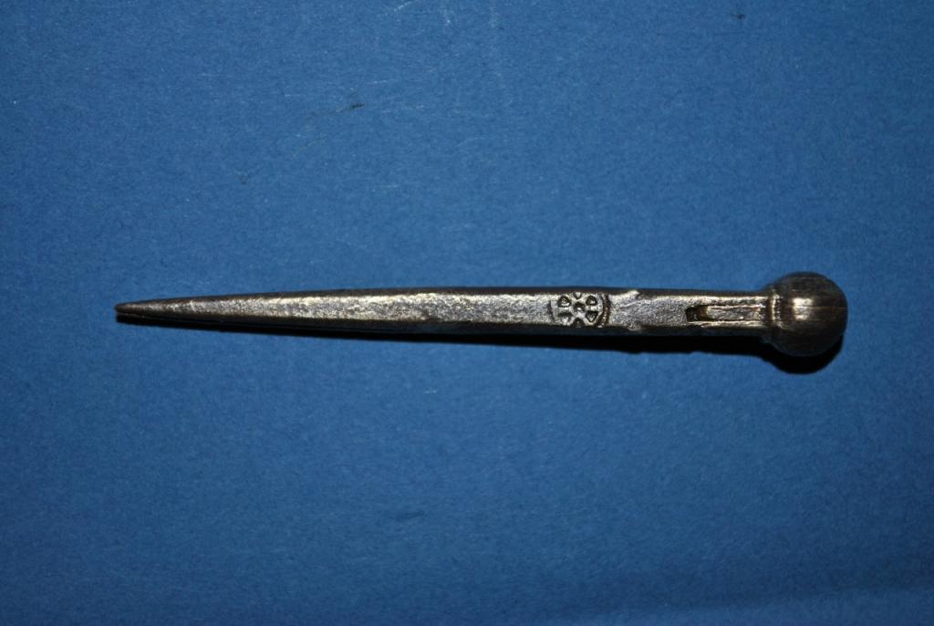 Die Länge beträgt 56mm, Breite 4x5mm, der Kopf hat einen Durchmesser von 7mm. Auf dem Kopf - der als Scharnier dient befindet sich eine Prägung in Form eines Speichen Rades (?).
