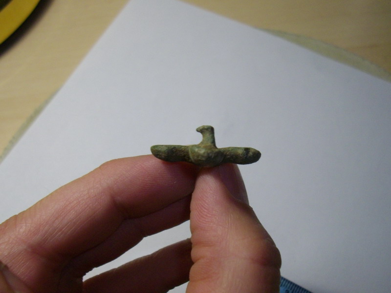 Handelt es sich hier nun um einen römischen Riemenbeschlag an welchen die Nieten etwas unglücklich gebrochen sind , oder um eine mittelalterlische Kreuzfibel ?
