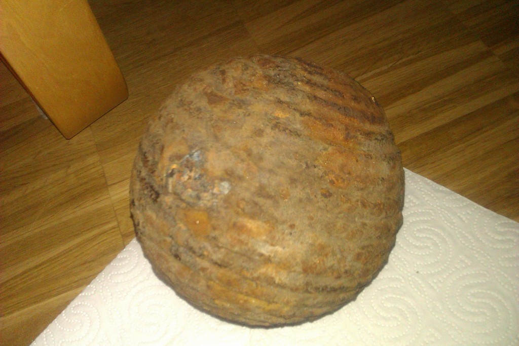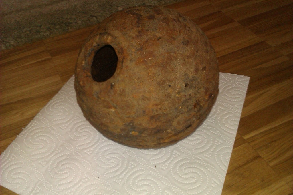 hier mal wieder was zum bestimmen, ich habe schon versucht diese Kugel welche innen hohl ist zu indentifizieren, leider vergeblich! Ich bin bisher von einer Kanonenkugel ausgegangen.