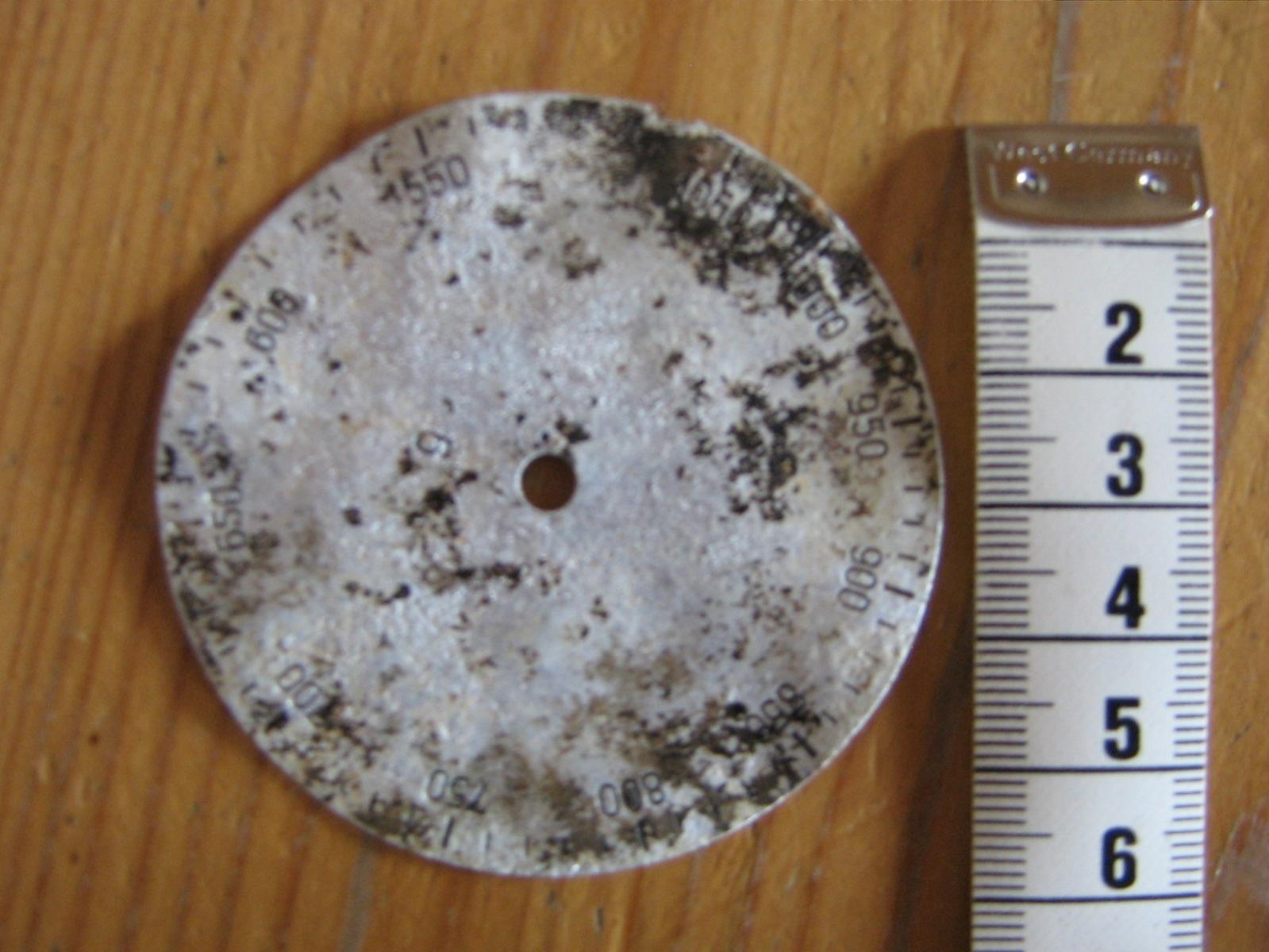 Ich hatte zuerst an ein Altimeter gedacht. In der Mitte gibt es noch die Prägung "6" oder "9", je nachdem, wie herum man es hält. Könnte auch ein kleines "g" sein. Daher vielleicht ein Bezug zu einer Waage. Im selben Loch habe ich auch noch andere Aluteile gefunden- zum Teil vernietet.