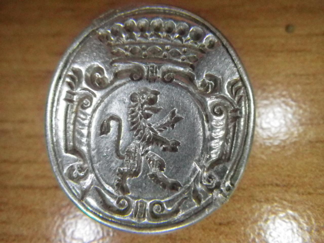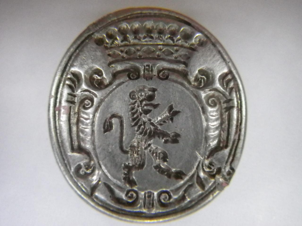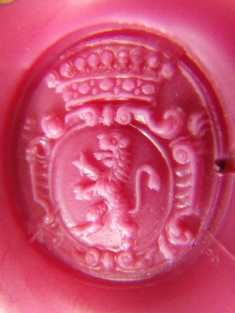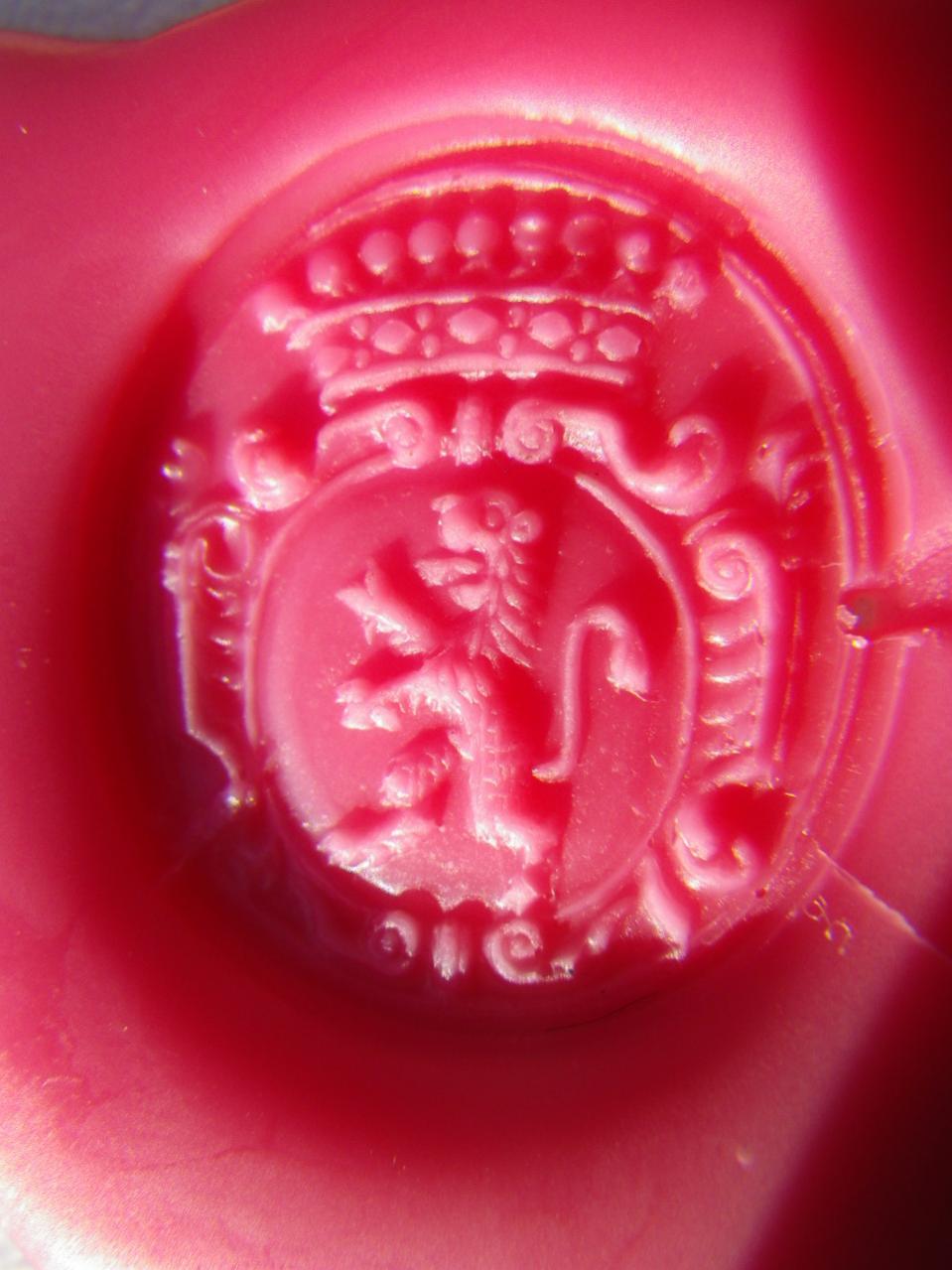 Darin sind ein vorgelehnter Löwe und ein aufrecht stehender Löwe,wie auf dem Petschaft,abgebildet.