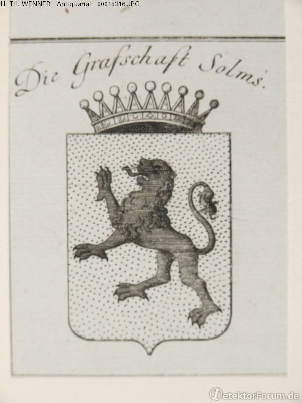 Das Durchsuchen von 3 Wappenbüchern hat mir nur eckige Augen gebracht, sonst nix. Erst ein gewisser Mücke aus einem anderen Forum, hat mir das letzte Bild geschickt und mir erklärt, dass 9 Perlen in der Krone für eine Grafschaft stehen. Eine Anfrage beim örtlichen Geschichtsverein in Solms verlief aber leider ohne Ergebnis. Evtl. ist die Ähnlichkeit doch nur Zufall? Auch nach einer Sammlerwertermittlung wurde ich schon gefragt.