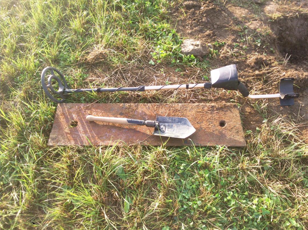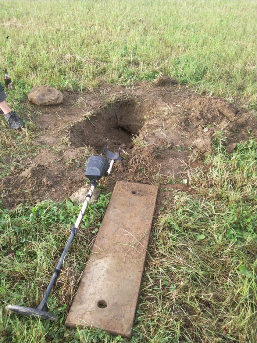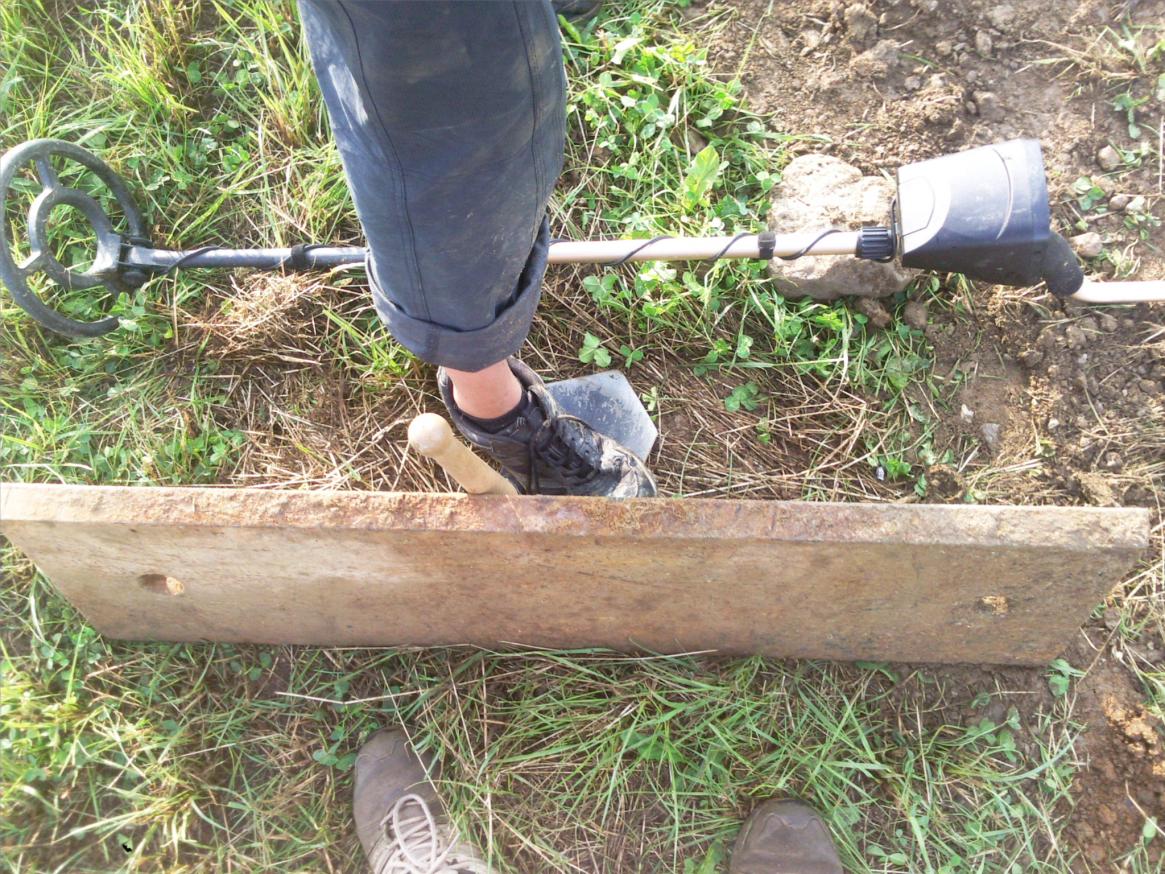 ). Am Anfang dacht ich es könnte vielleicht ein Frontgewicht vom Traktor sein, aber die Form lässt mich zweifeln. Eine lange Seite ist angeschrägt und es ist auf beiden Seiten ein Loch, wo eins einen größeren Durchmesser hat. Im Grabungsloch war auch nuch ein zerfallener Holzbalken und in der Nähe ein Betonfundament.
