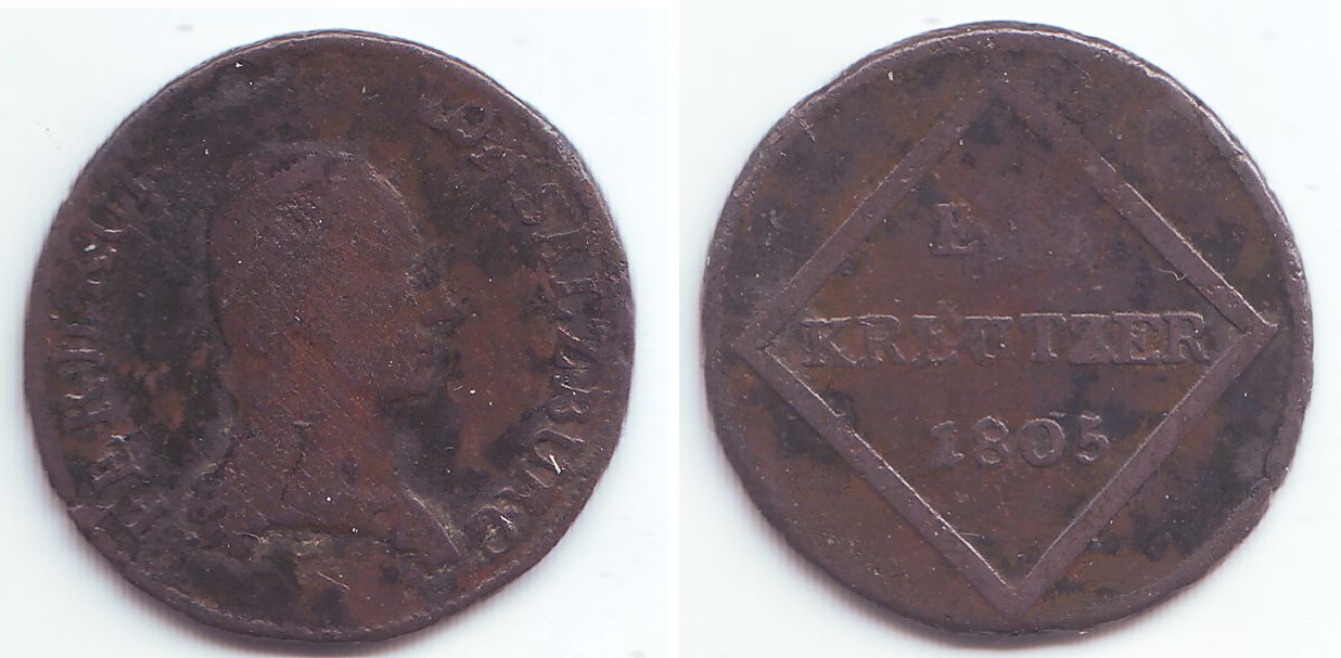 handelt es sich hier um eine Riemen- oder Schuhschnalle. Wg. der Größe denke ich an Zweiteres. Weiterer Fund war die tote Kupfermünze. Diese würde ich als 1 Kreuzer Österreich-Salzburg unter Erzherzog Ferdinand identifizieren, Anfang 19. Jhdt (ausser jemand hat eine bessere Idee):