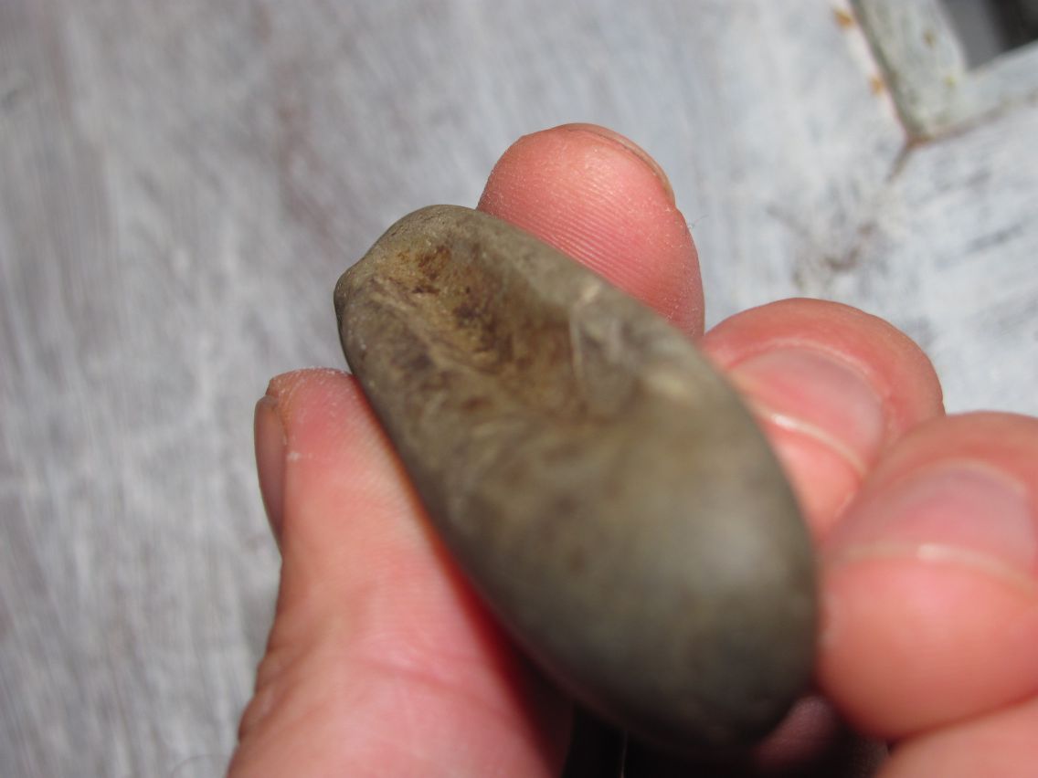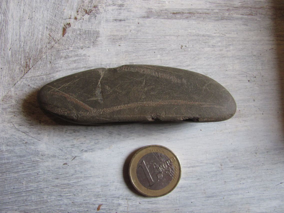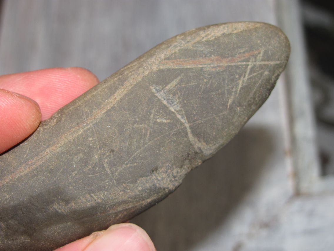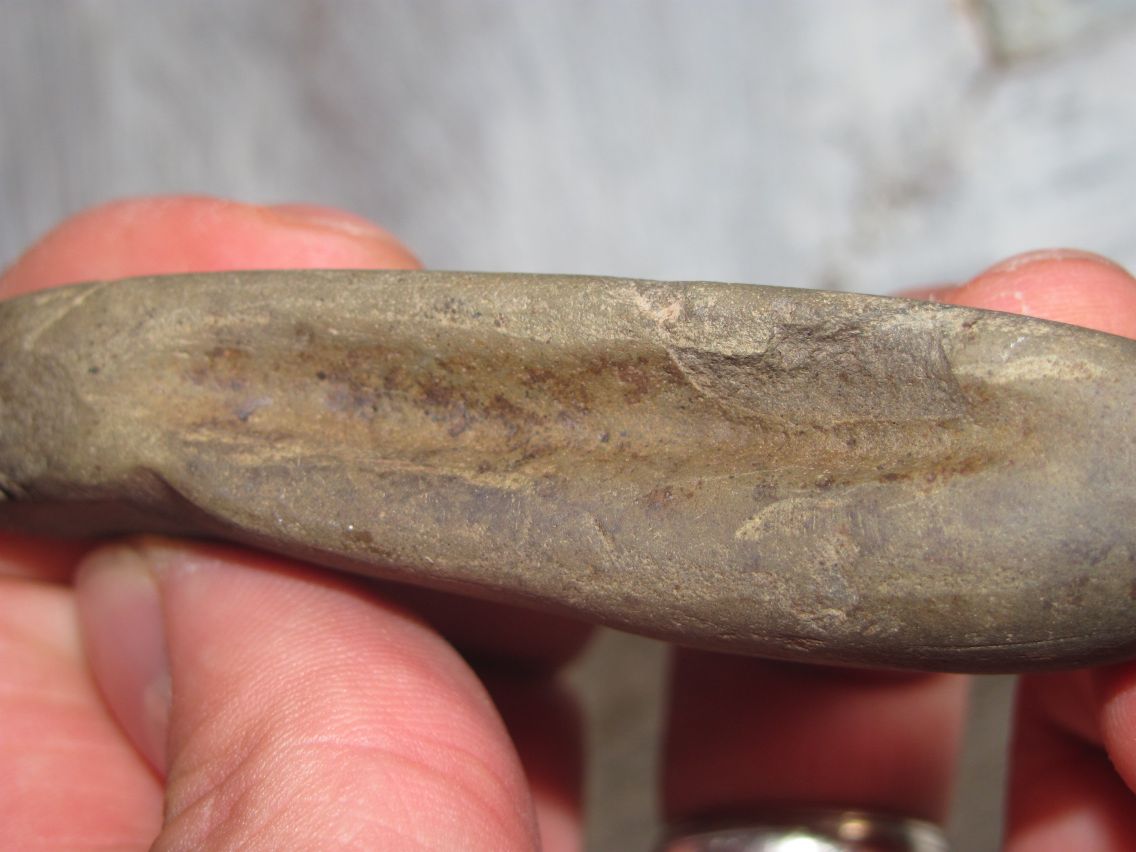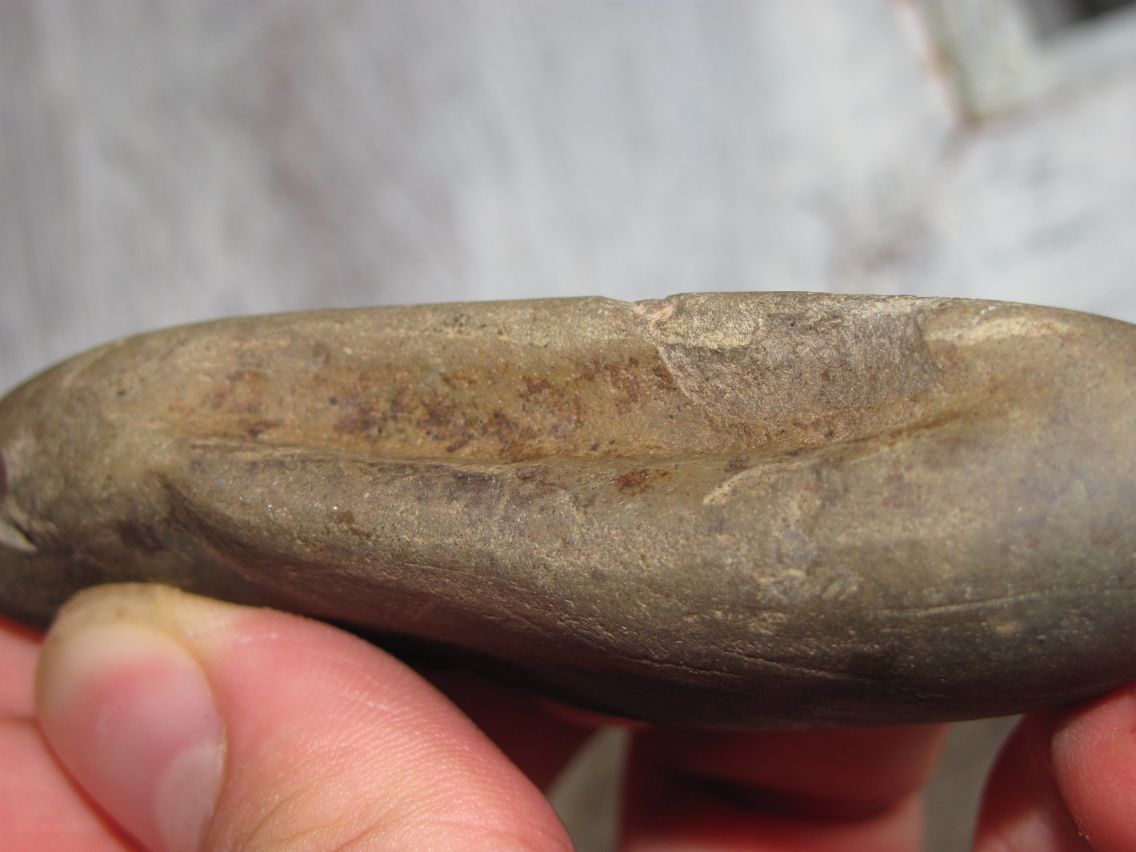 Besonders auffällig finde ich jedoch die Rille am unteren Teil des Steins. Ich kann mir nicht erklären, wie die da auf natürliche Weise, durch Rollen oder Wasserschliff entstanden sein sollte.