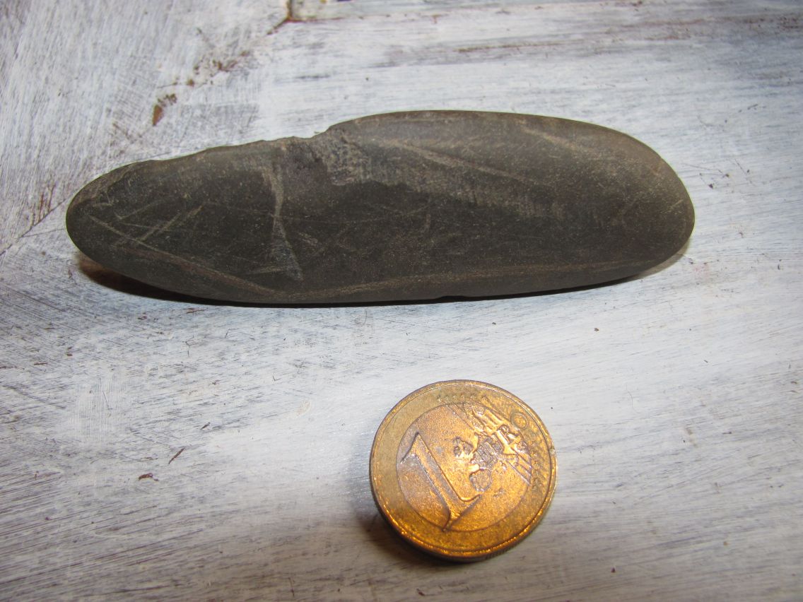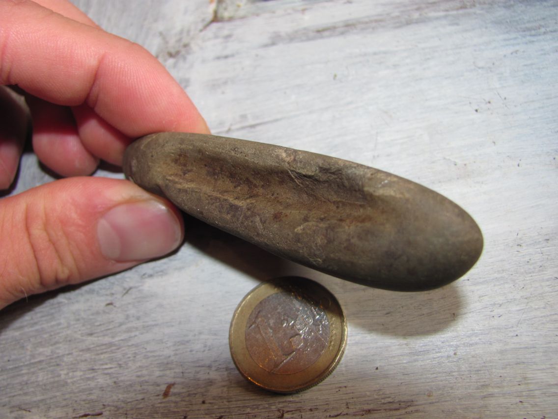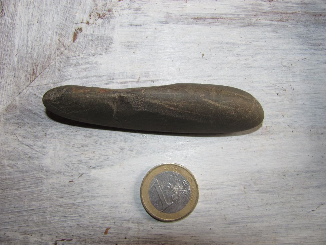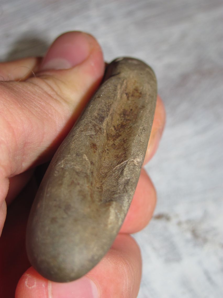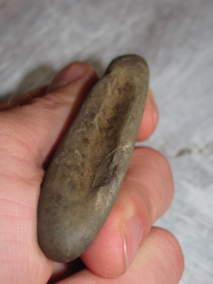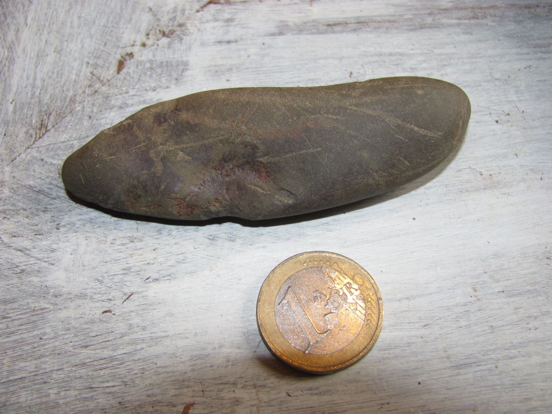 Besonders auffällig finde ich jedoch die Rille am unteren Teil des Steins. Ich kann mir nicht erklären, wie die da auf natürliche Weise, durch Rollen oder Wasserschliff entstanden sein sollte.