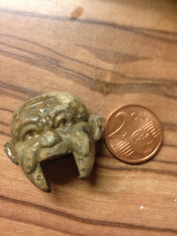 Was wiegt viel und hat oben und unten eine rechteckige durchgängige Öffnung, von beiden Seiten ein Gesicht und lag auf einen Acker?