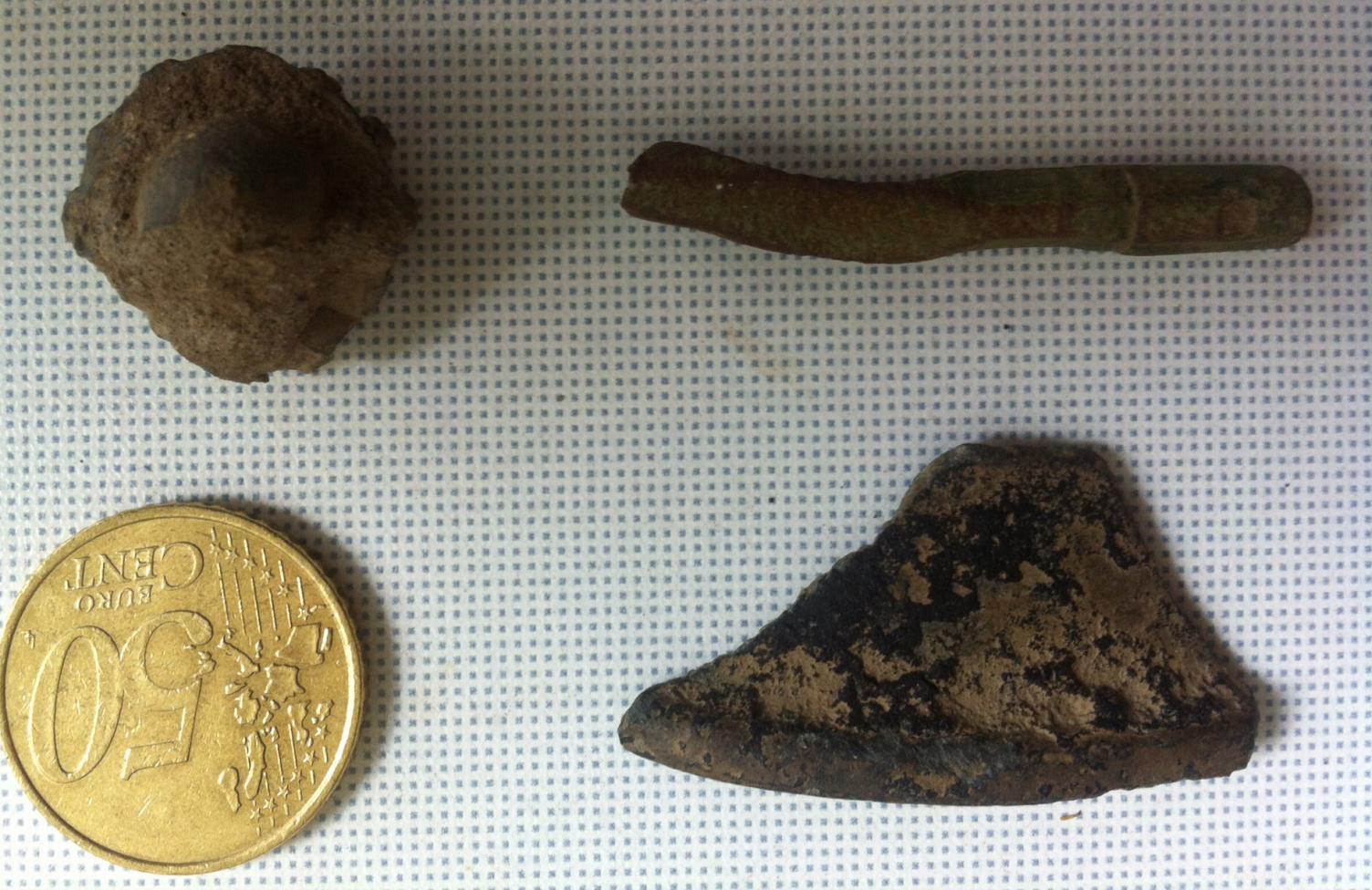 Das Blei-Ufo links oben ist ein "Sauposten", also jagdliche Munition, die in dieser Art auch noch heute verwendet wird.Das unten rechts könnte ein Glocken-Bruchstück sein.
