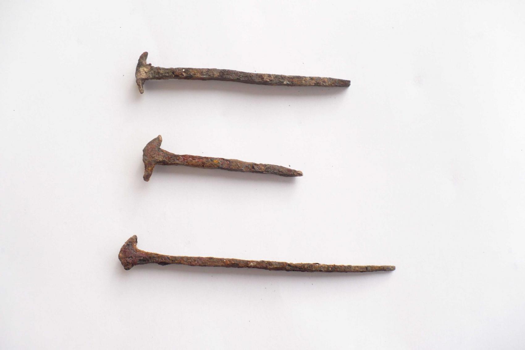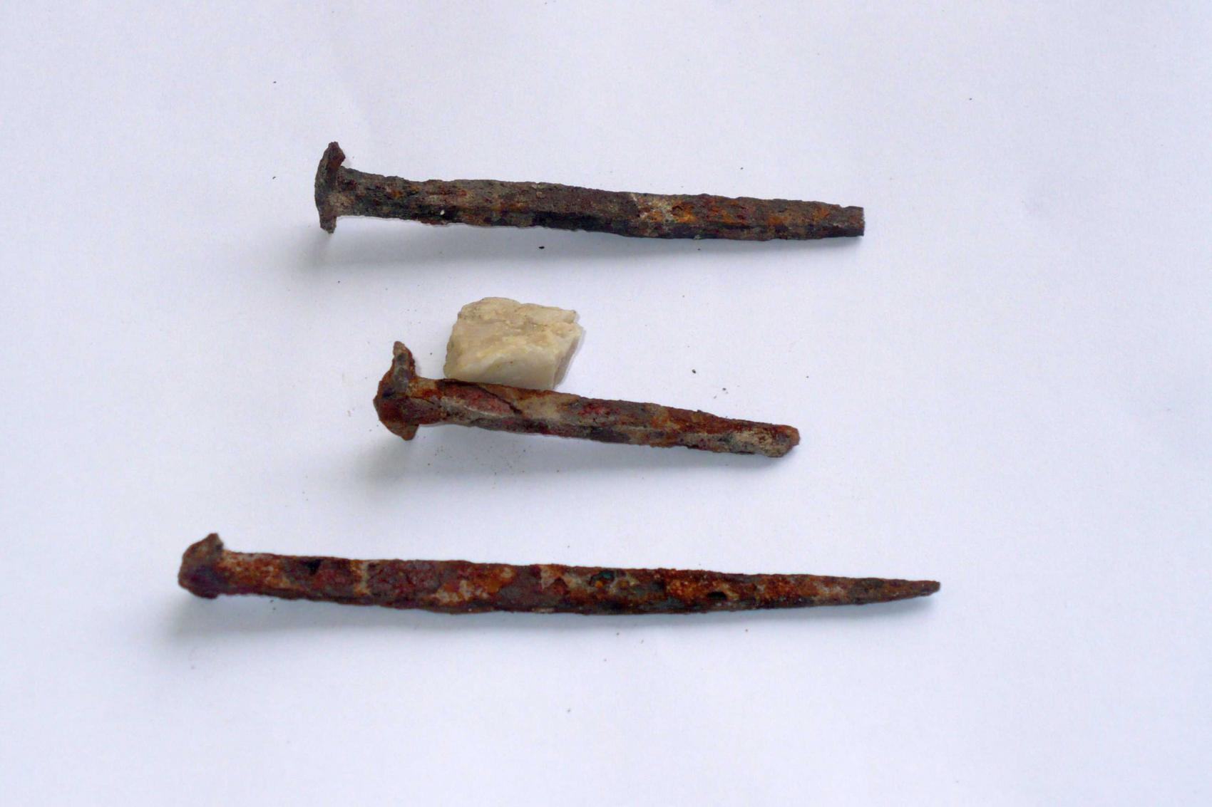 ein Freund hat bei einem Wanddurchbruch diese Nägel (der längste ca. 15cm] im Mauerwerk einer Außenwand (ca. 75cm dick) gefunden und mir die Bilder zukommen lassen. Bei den Nägeln lag noch eine Menge Asche, wozu ich sagen kann, dass dieses Haus bei drei Stadtbränden teilweise bis stark in Mitleidenschaft gezogen worden ist. In der Höhe einer ehemaligen Zwischendecke bzw. des ehem. Dachstuhls sind die drei nun aufgetaucht.