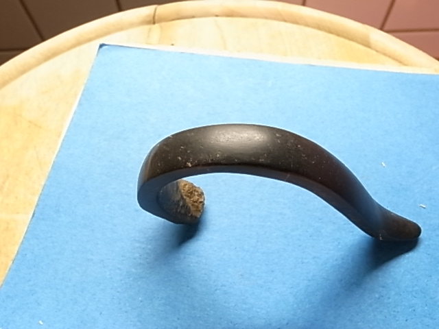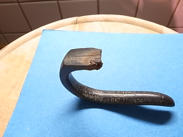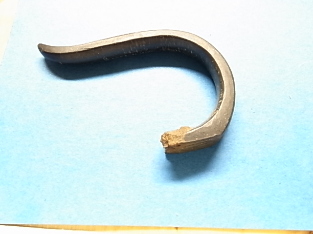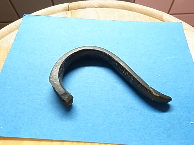 Ein nachträglich mit Eisenniet reparierter Henkel, original war der angelötetö dann die Lötresten nach dem Bruch abgefeilt und mit ner Eisenniet wieder gefestigt. Als die durch wässrige Lösungen (Wein/Bier) erzeugte Korrosion erfolgreich war, fiel der Henkel ab und das Gerät war so alt, da wurde es entsorgt. Der Henkel sieht mir der Form nach eher neuzeitlich aus, also ab 1600, unter Umständen noch spätes MA...
