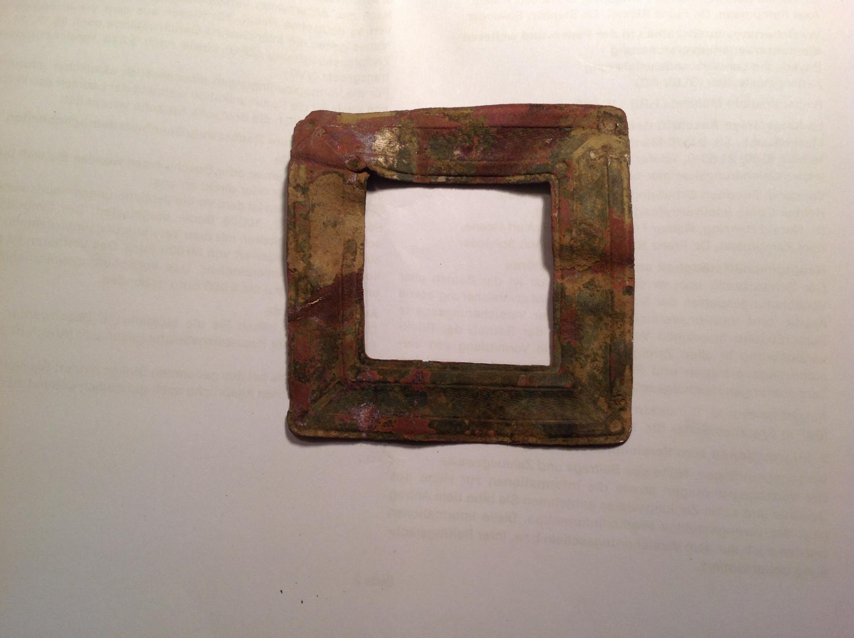 Das Teil ist nicht dick. Es hat ca. 1 - 2 mm. Deshalb kann ich mir keine Gürtelschnalle vorstellen. Es hat aber ein Muster um das Quadrat und das hat das Teil vor der großen Tonne bewahrt.