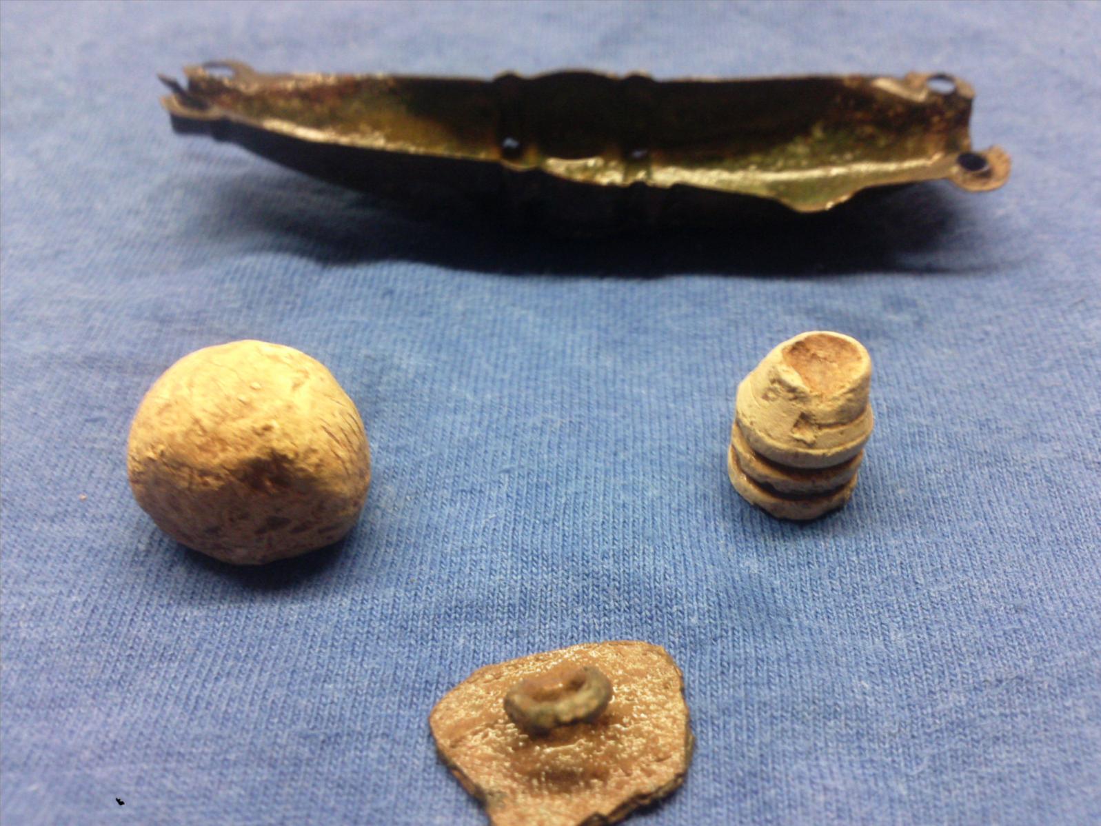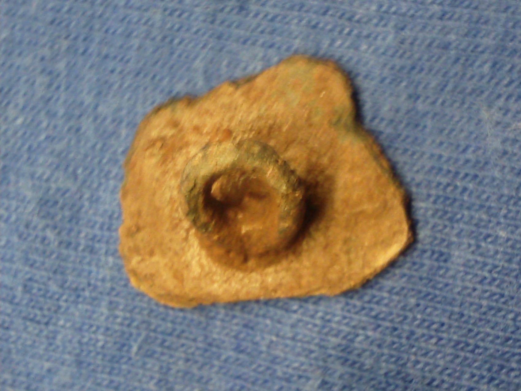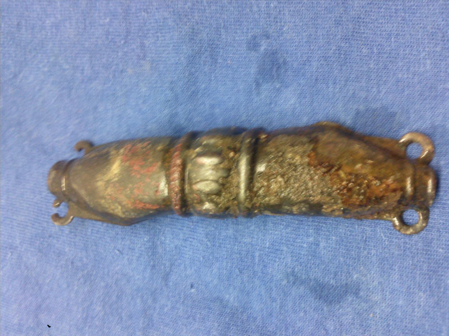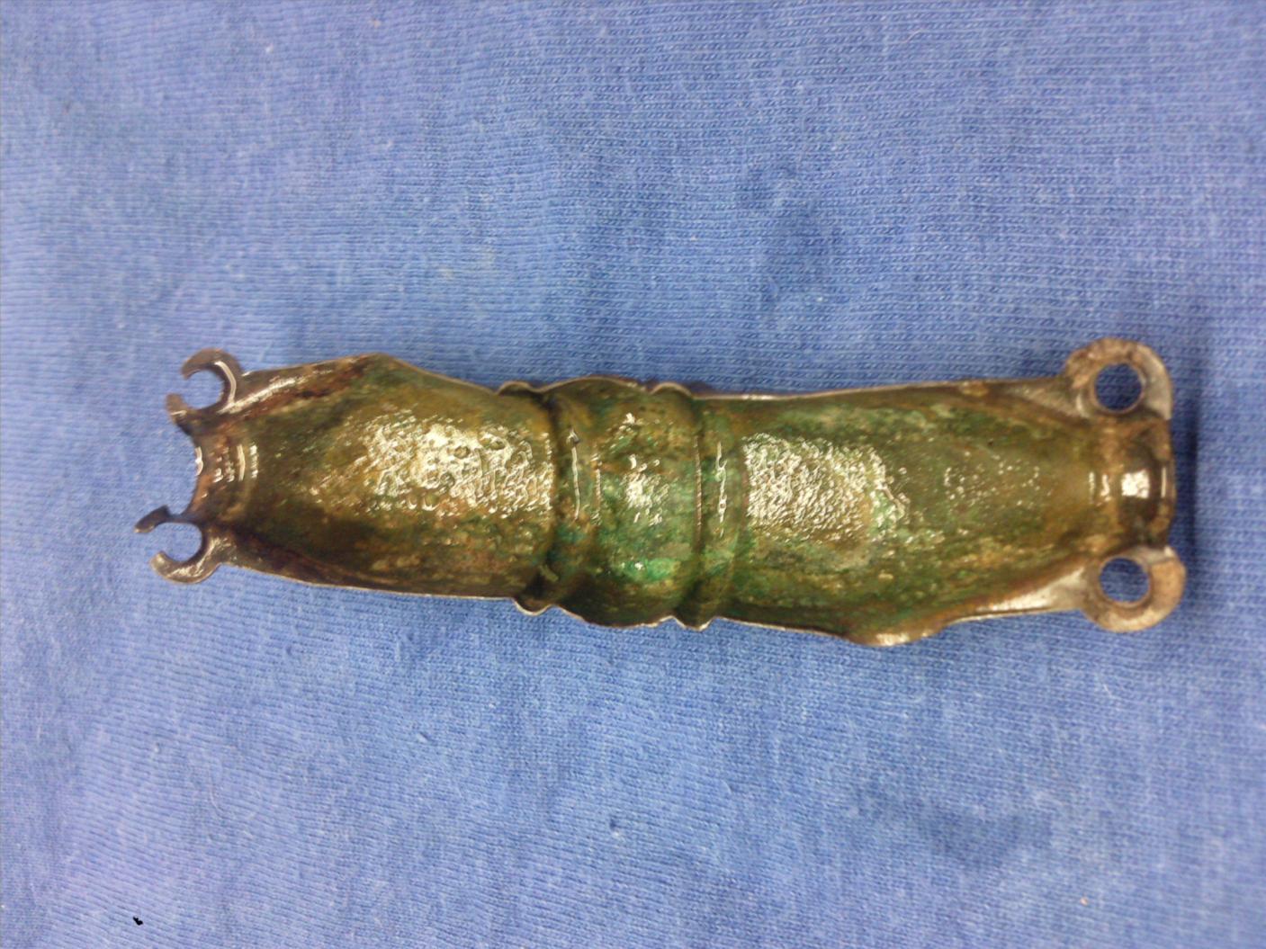 Da die Familie vorhin ausgeflogen war und ich alleine daheim war bin ich kurzerhand noch mal mit meiner Bestie und der Sonde losgezogen um in den letzten Stunden noch schnell einen neuen Acker anzutesten. Naja, er war leicht überfroren und die Signale hielten sich in Grenzen. Es kam nur ein zerstörter Knopf, eine Bleikugel, ein Spitzgeschoss ohne Spitze und dieses seltsame "Ding". Scheint aus Kupfer zu sein. Es hat 4 Ösen von denen 2 gebrochen sind. Sieht verziert aus, aber kann ja auch ein Sinn haben. Jedenfalls hab ich kein Plan wozu es gut sein könnte. Vieleicht weiß es jemand von euch. Wünsch euch noch einen schönen Jahreswechsel.