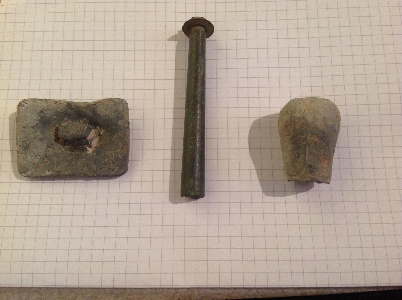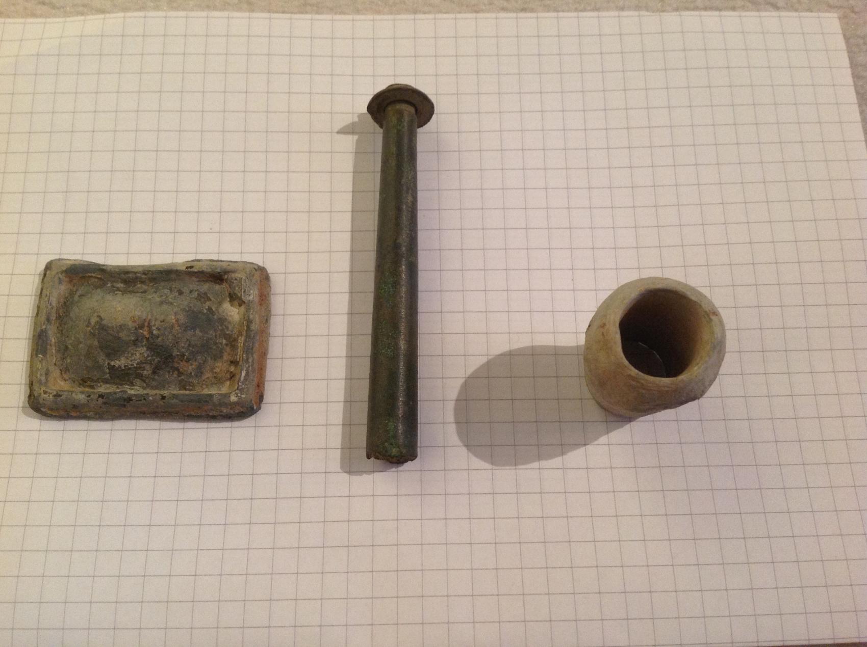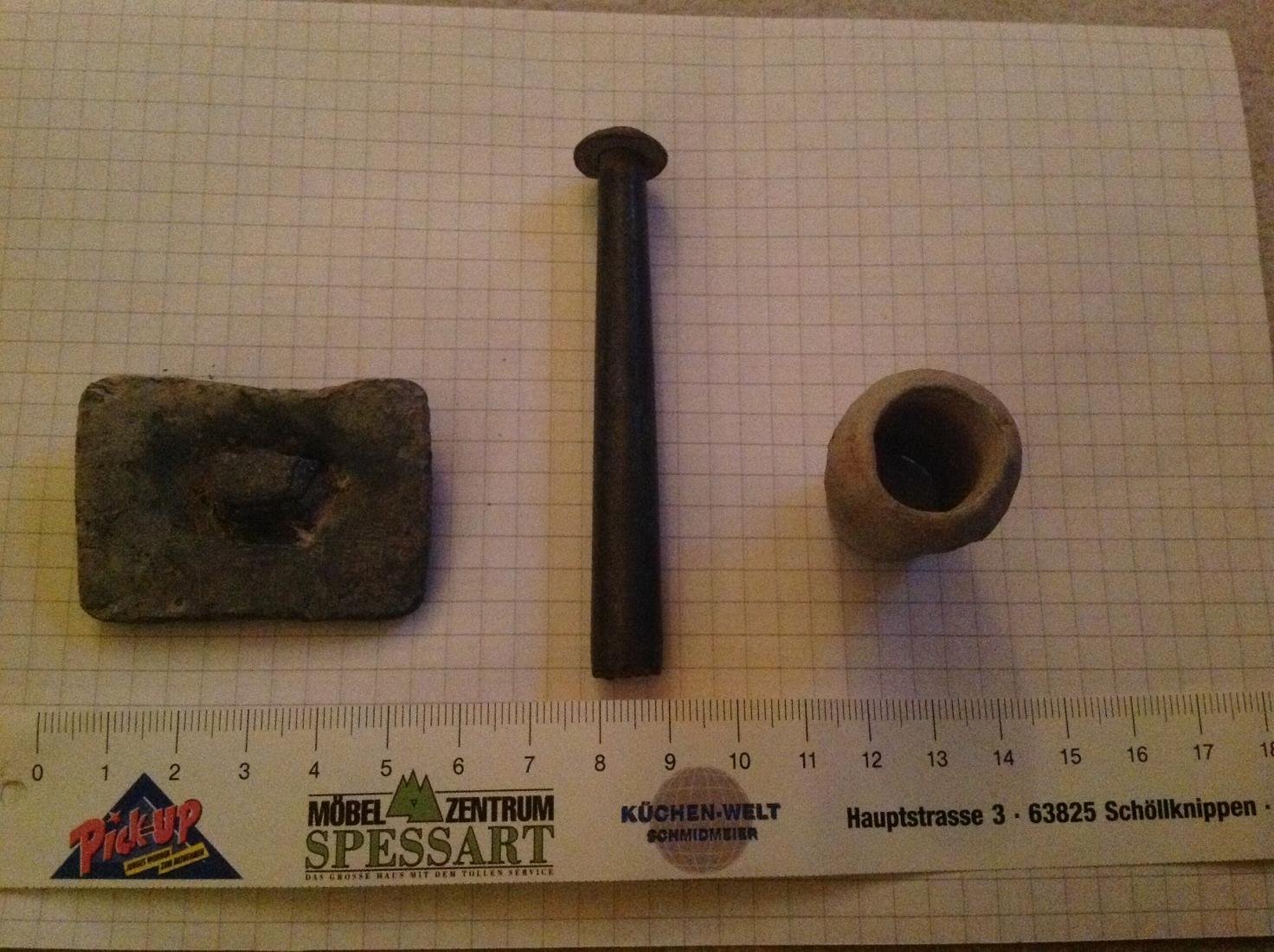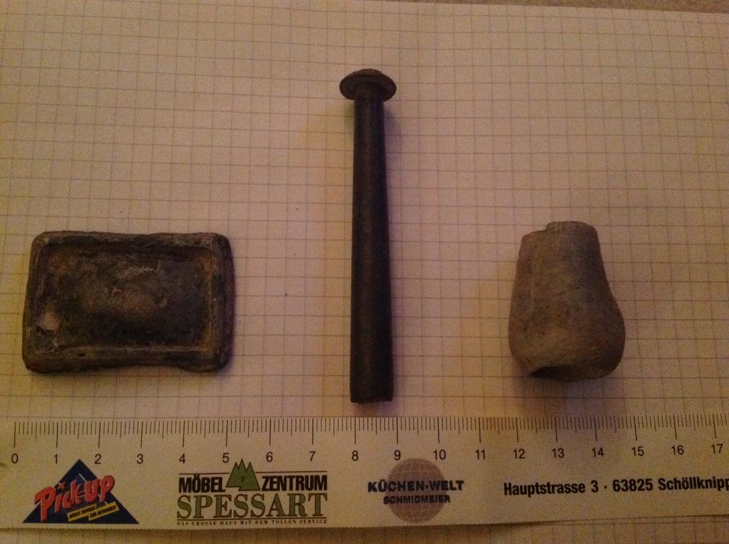 War heute mal auf einer neuen Wiese und da kamen u.a. folgende UFOs. Das linke Rechteck dürfte aus Blei sein. Ebenso das rechte Teil. Das rechte Teil ist innen hohl. Das mittlere Teil ist ca. 8 cm lang. Von der Rückseite kommt noch ein Bild. Danke schon mal im Voraus.