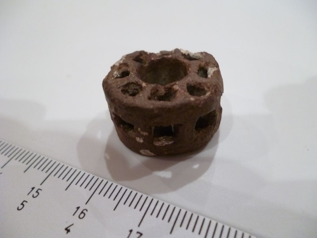 für Mechanik kommen mir die Löcher zu uhnförmig vor, und wie su schon sagst, ein zu weiches Material, aber nach Ziergegenstand sieght es auch nicht aus, es sei denn in den Löchern wären irgendwelche Steine oder ähnliches eingeassen gewesen, dann könnte es der Knauf von einem Stock gewesen sein oder so.