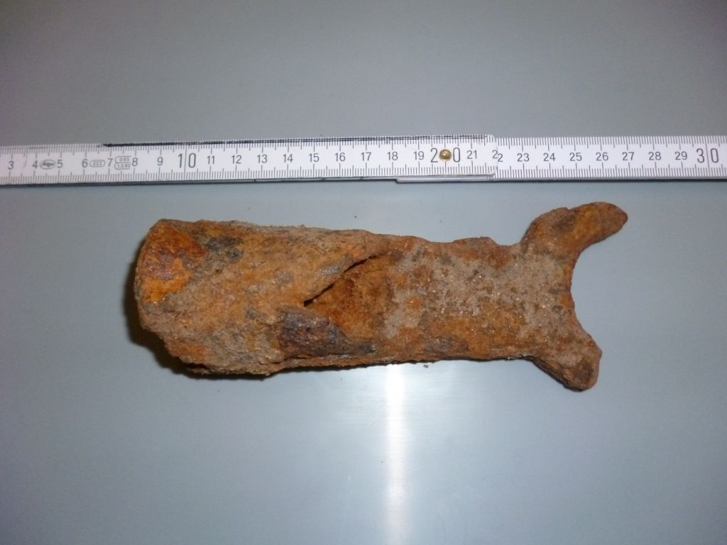 Ich hab vor einigen Tagen dieses Eisenobjekt in einer Wiese am Fluß gefunden. Lag ziemlich tief im Boden. Beifunde gab es außer den üblichen Aluobjekten nicht. Vor längerer Zeit hatte ich aber in unmittelbarer Nähe ein kleines Bronzepferd gefunden, welches ich hier im Forum schon vorgestellt habe.