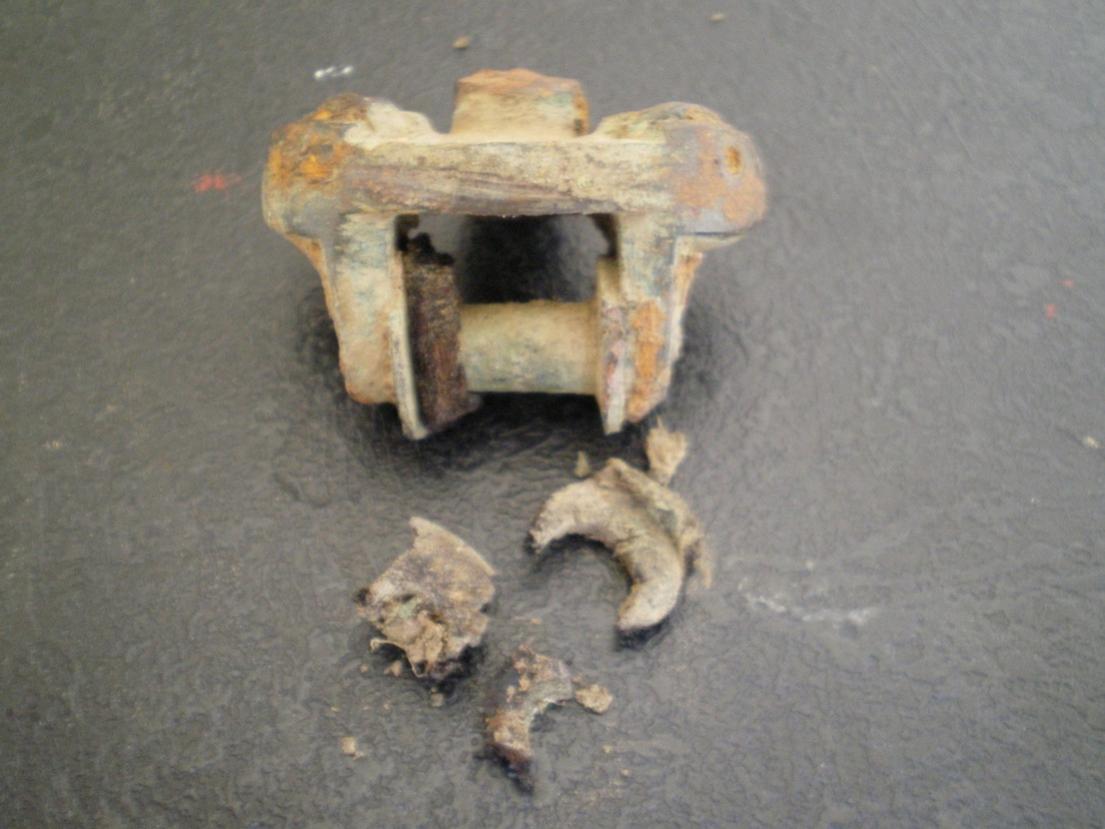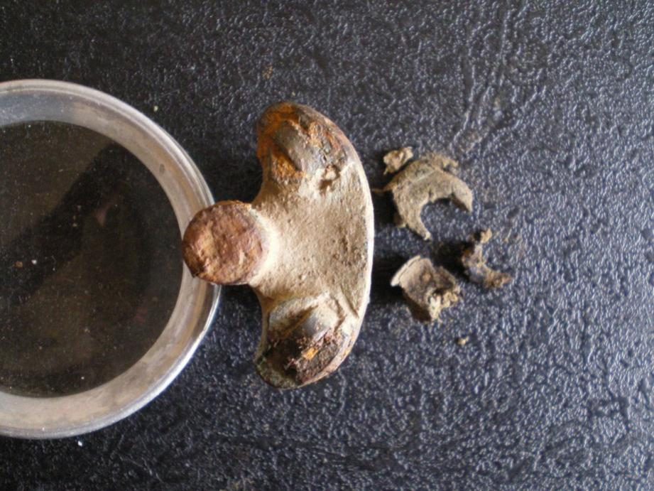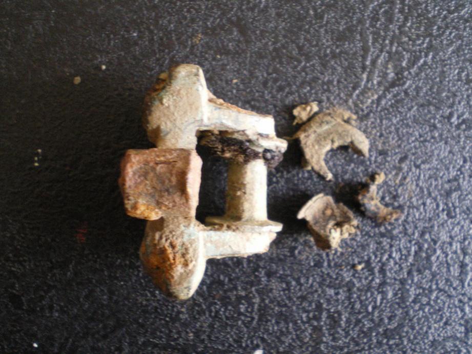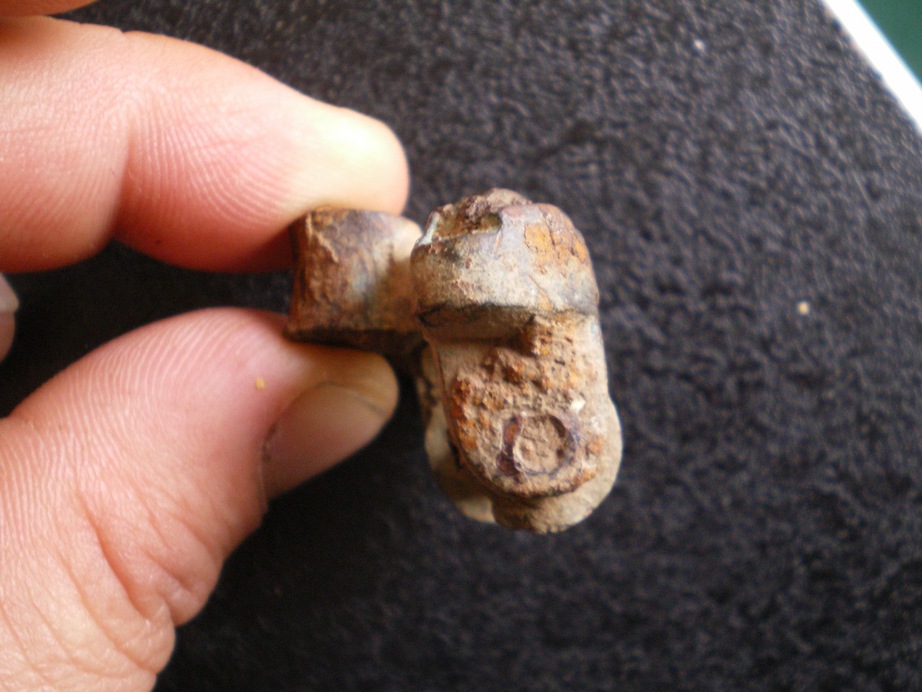 Moin Männers...dieses Teil fand ich letztens und stellt mich vor ein Rätsel. Es mißt ungefähr 2,5 mal 2,5cm. Die ausgefallenen Bröckchen sind definitiv Lederreste und waren um diesen runden Steg-der mit Sicherheit mal beweglich war. Zum "Draufsichtsbild" (mit der Lupe)-da sind zwei runde Dingens die mit Eisenstiftchen festgemacht wurden-das hintere runde Knubbelchen weißt auch Rostspuren auf. Ich wollte das Teil schon in die Messingkiste schmeißen-aber es scheint mir doch recht interessant zu sein. Hat jemand von euch sowas schon mal gesehen und kennt gar den Verwendungszweck? MfG Matzn
