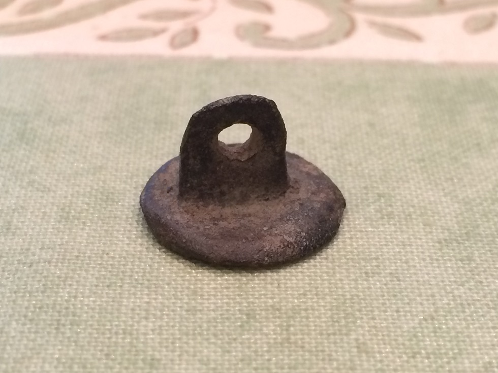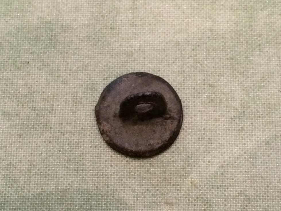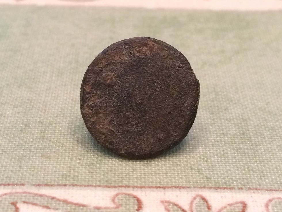 ich vermute hier einen alten knopf (meist aus blei) mit typischen süddeutschen floralen muster. derer besitze ich so einige.. ich kram mal rum und zeig dir dann fotos .. müsste aber ein knopf mit blütenblättern sein.