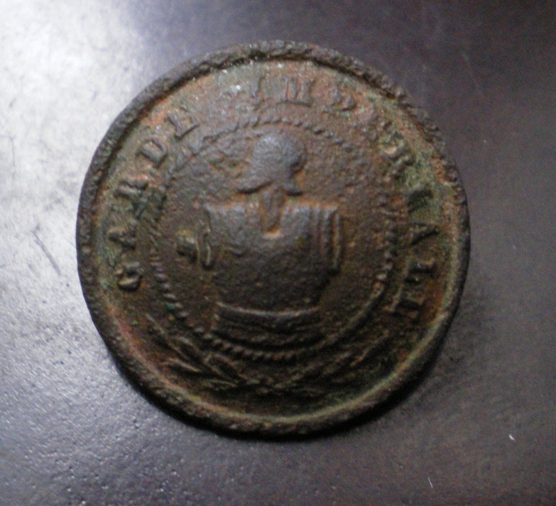 Moin Männers. Diesen 17mm Winzling hab ich schon etwas länger liegen. Er ist "Nachnapoleonisch"),leicht bombiert und mit einer Art Stegöse. In der Mitte ist eine Art Rüstung-welche ich von den alten Sappeurknöpfen her kenne. Außen steht: Garde Imperiale. Wenn ich bei Gockel diese Wortkombination eingebe seh ich Bilder von Knöpfen aus der Napoleonzeit bis 1814-also die typischen Gardeknöppe mit den bekrönten Adlern. Was ist es also wirklich und in welche Zeit passt er ungefähr? Vielen Dank für eure Mühen,Gruß Matzn