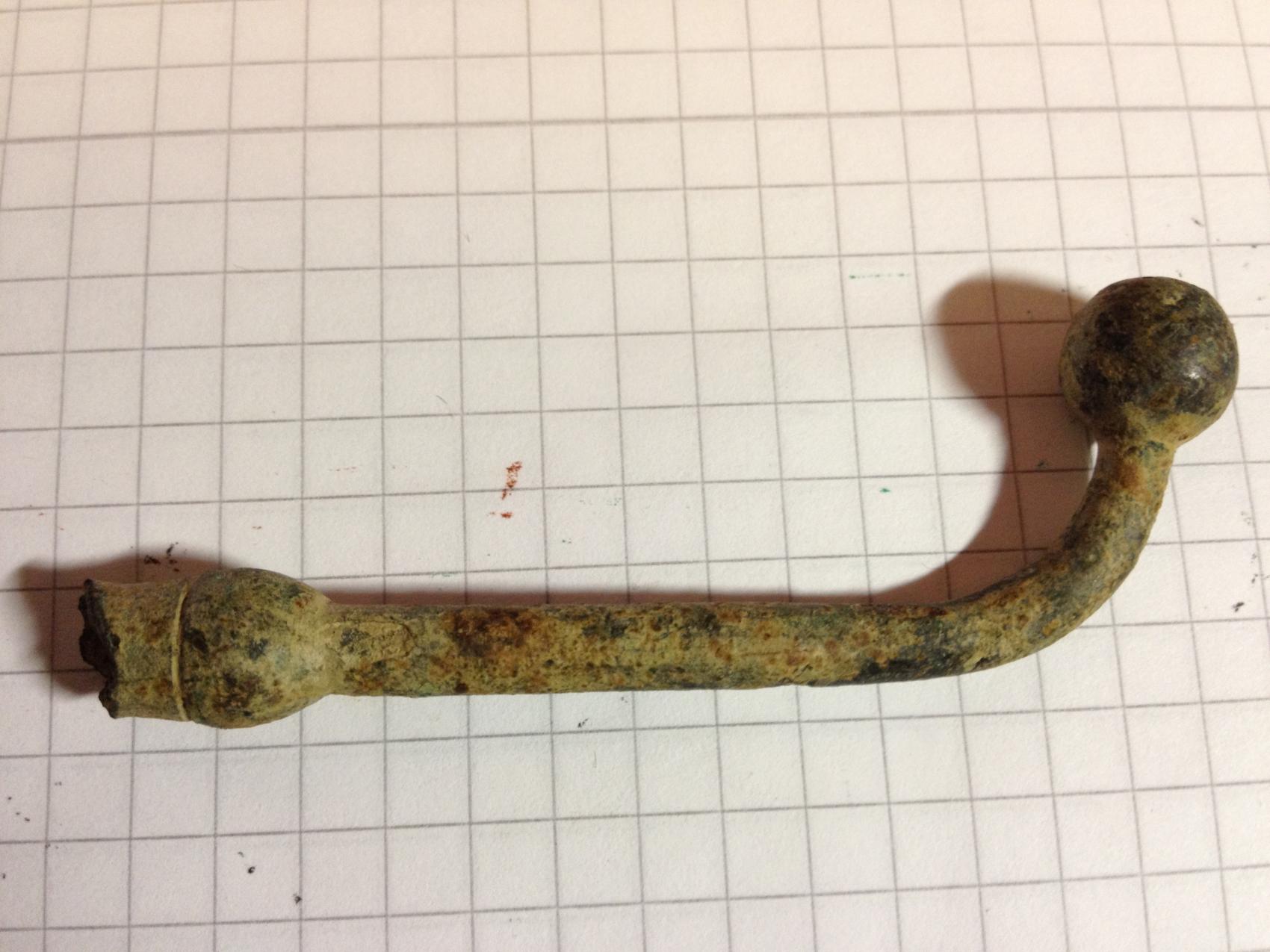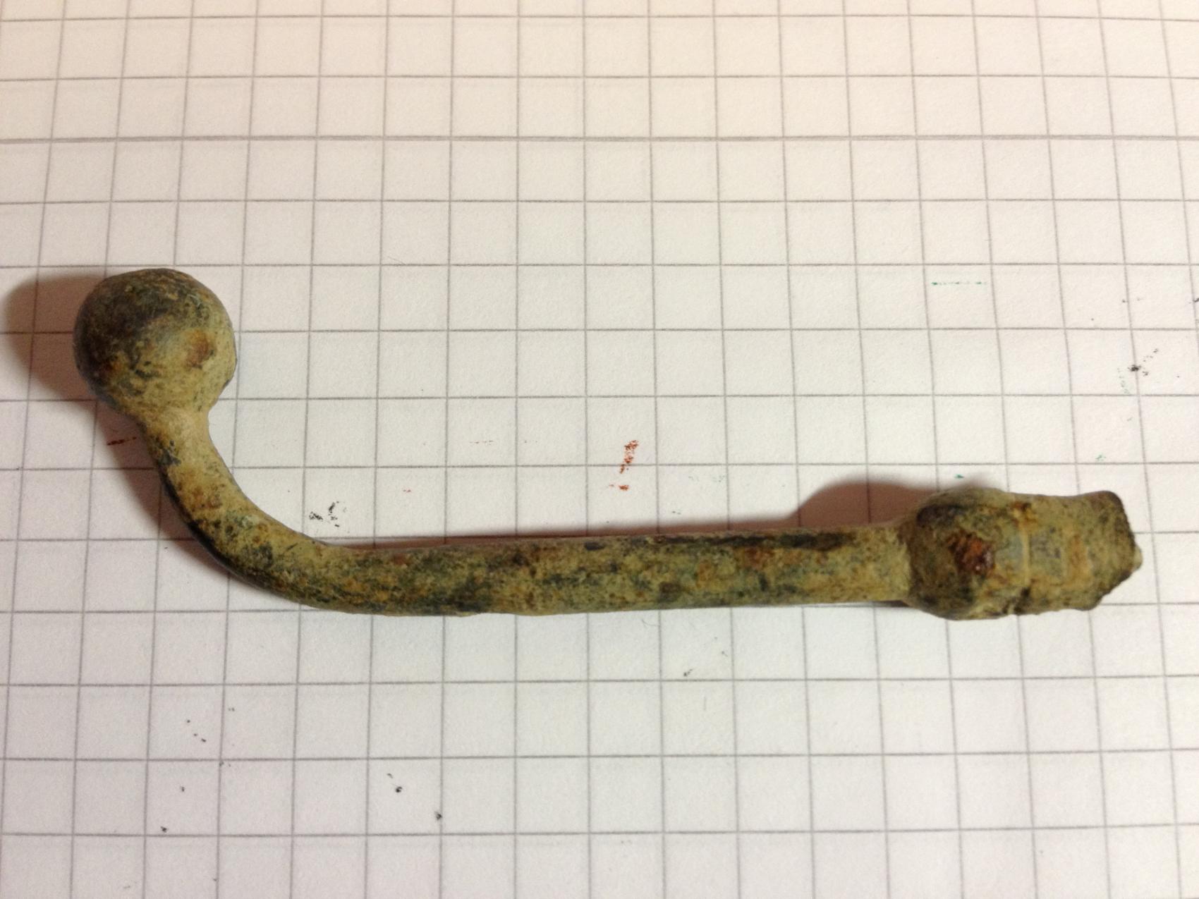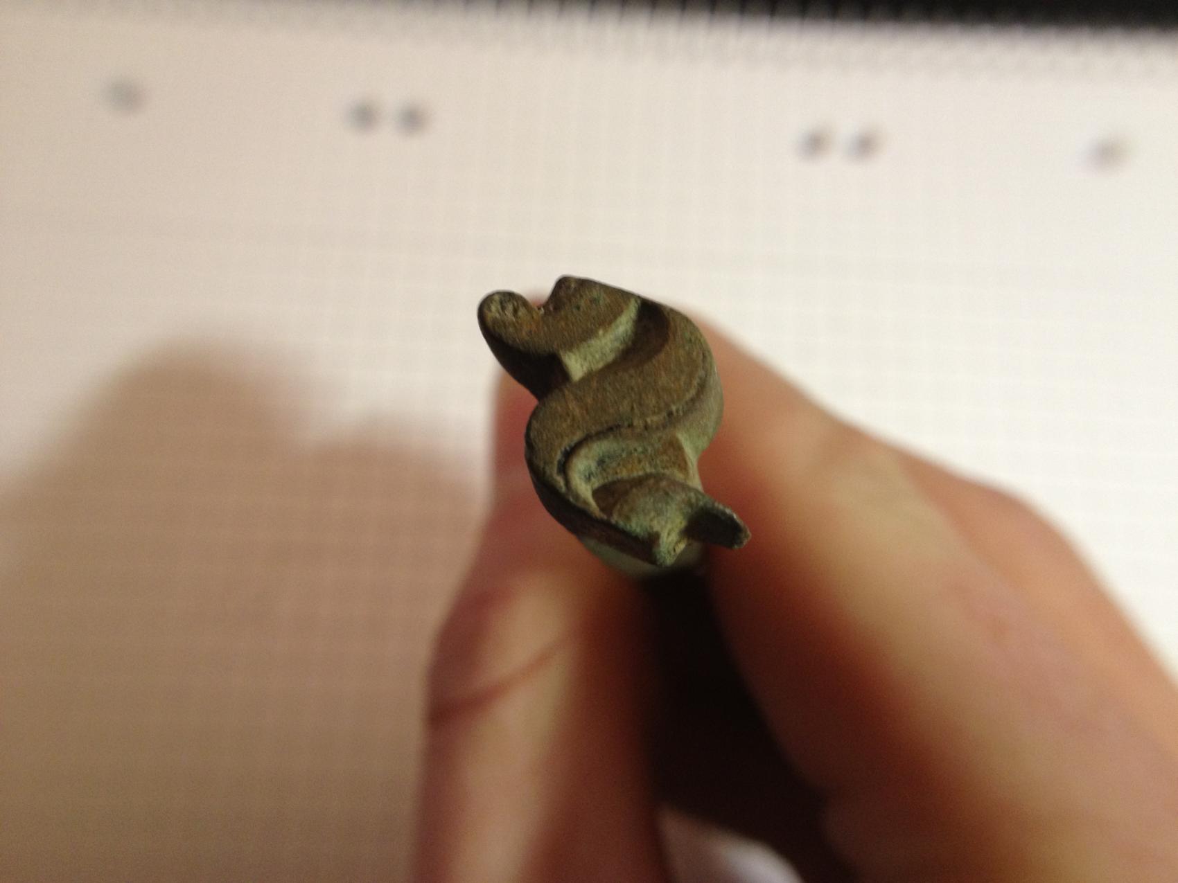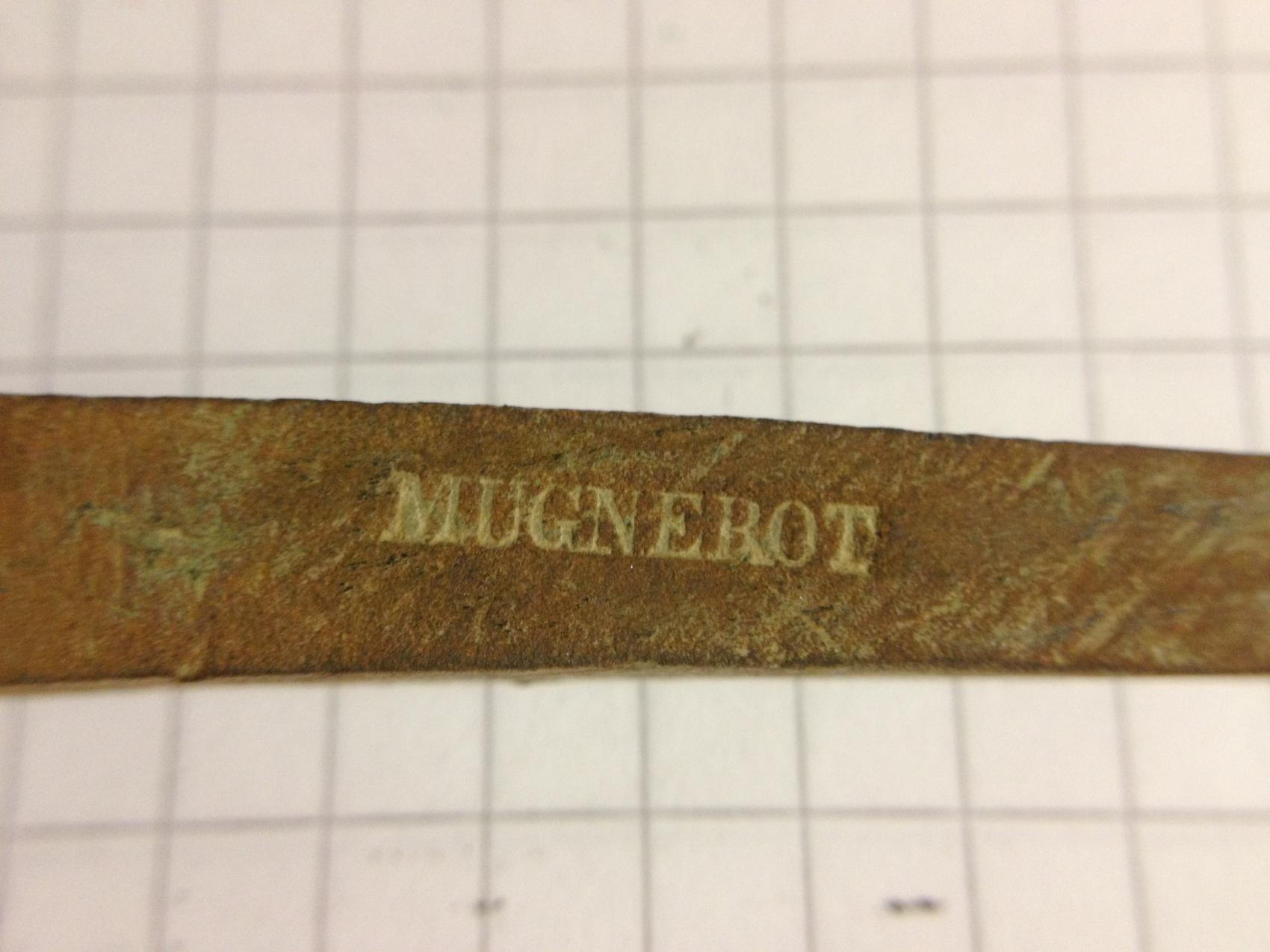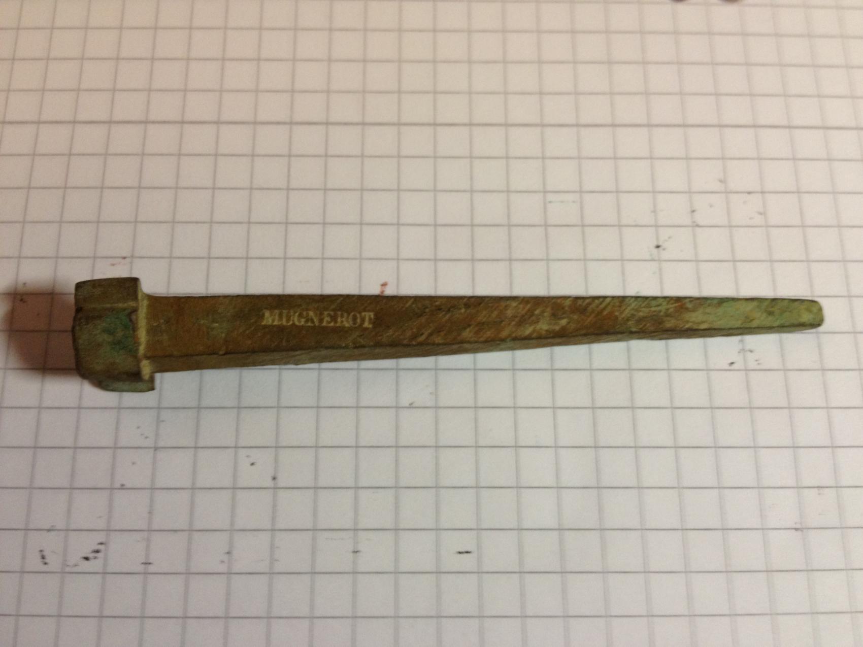 1. Ein Nagel oder Siegel welches mit "MUGNEROT" bestempelt ist. Der Kopf sieht nach einem alten S aus. Das Material kann ich leider nicht genau bestimmen.