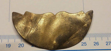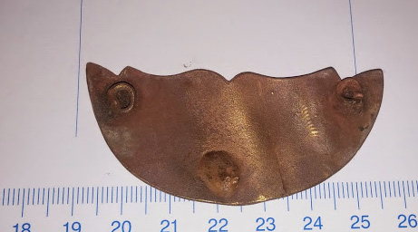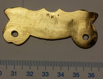 Was mag dieses Stück Messingblech geschmückt haben? ca 1mm stark, auf der Rückseite 3 Ösen, von denen noch 2 erhalten sind.Gruß