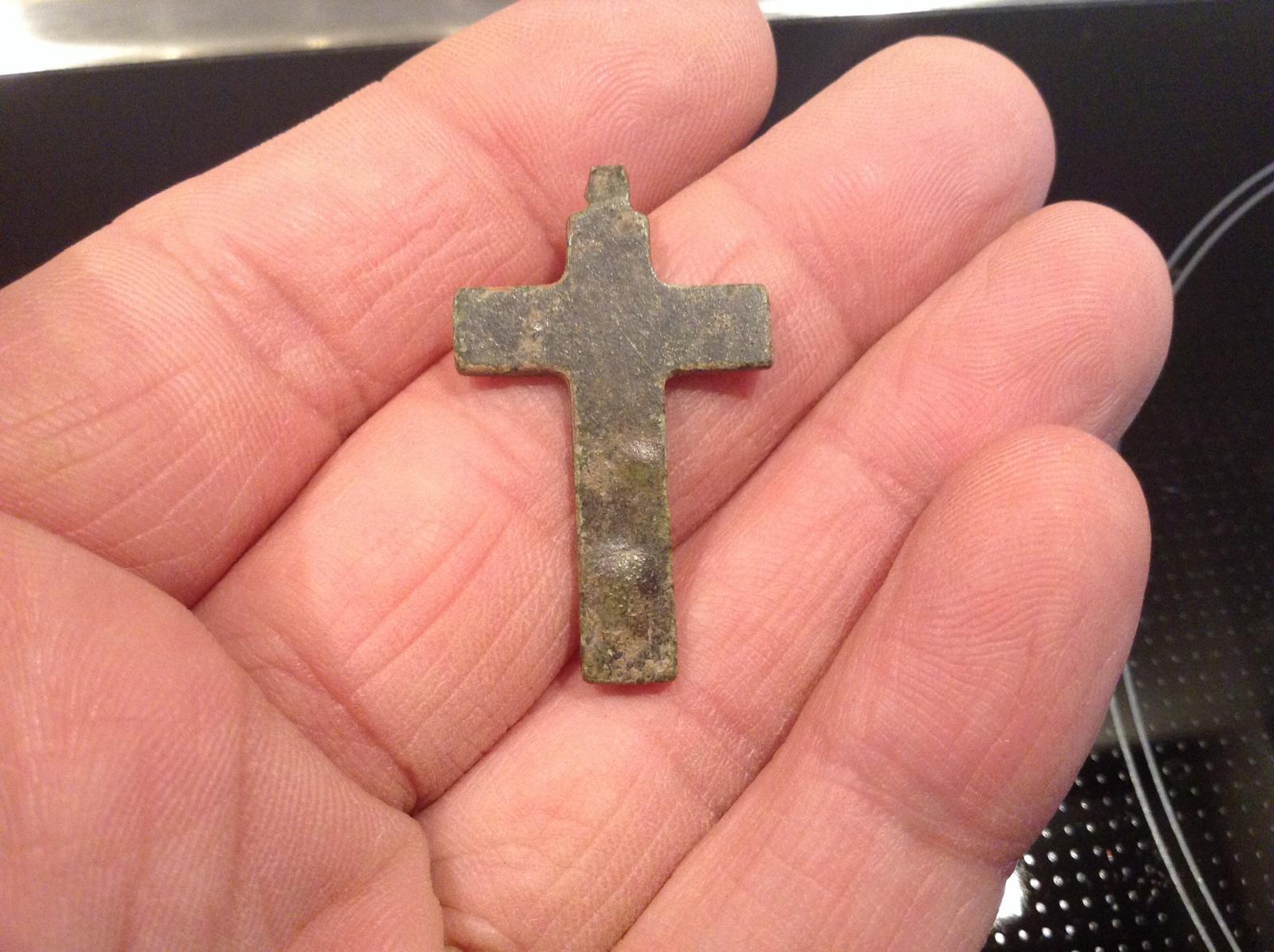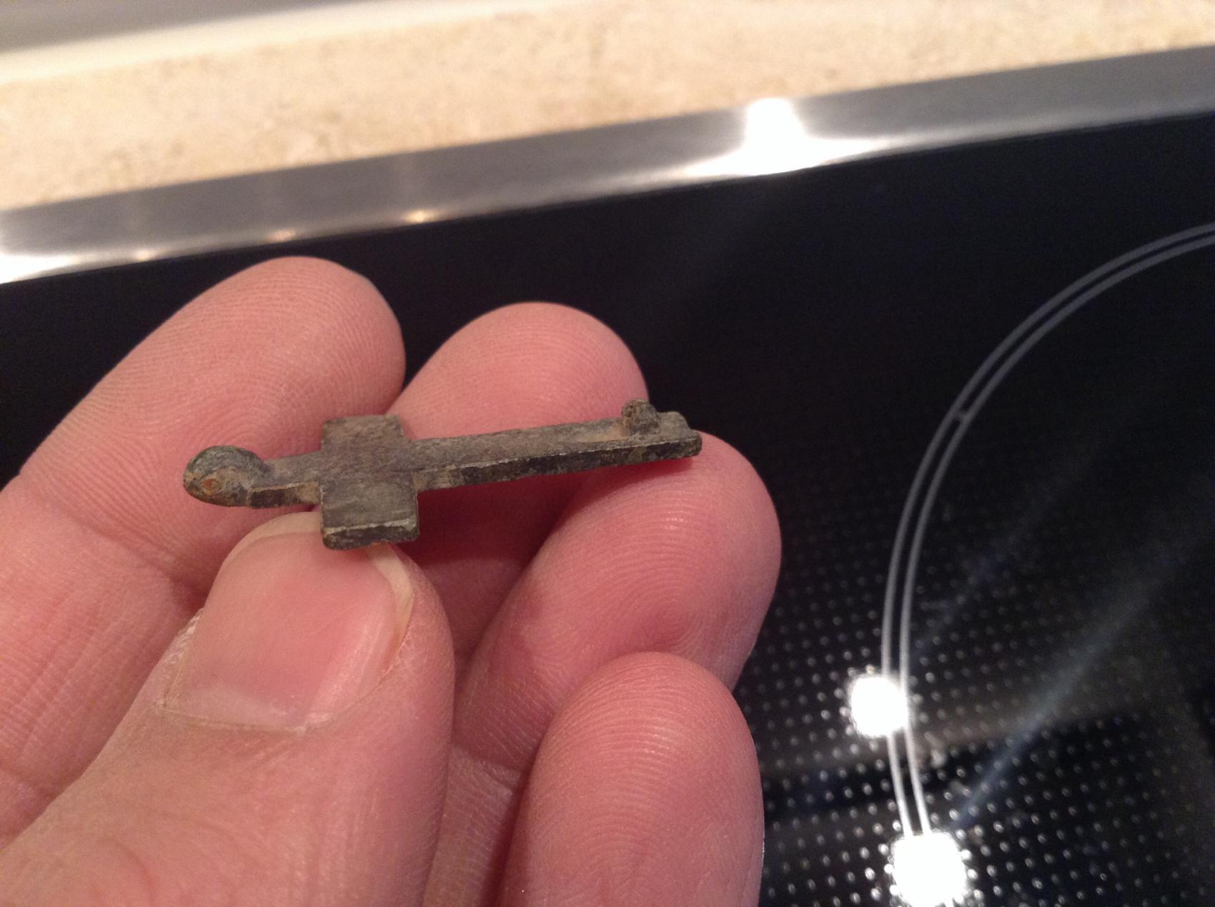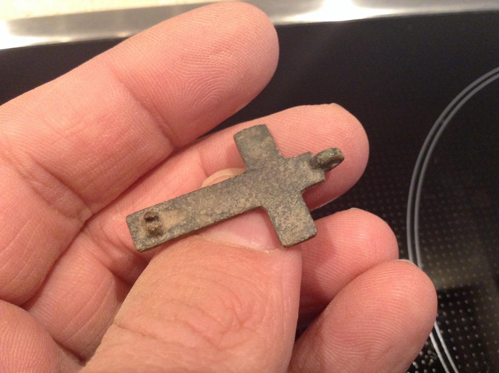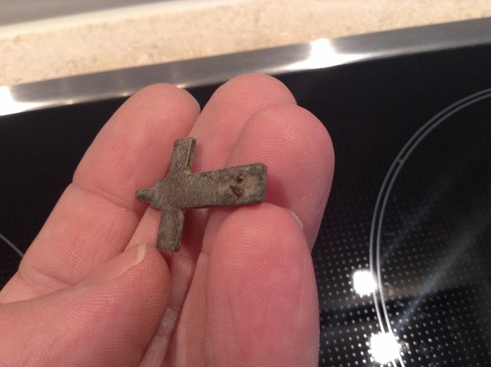 Ich habe hier dieses Kreuz gefunden. Zuhause merkte ich das am unteren Ende was ist das wie ein nadelrast aussieht. Oben siehts aus wie ein Scharnier. Beifunde war ein vergammelter Römer.