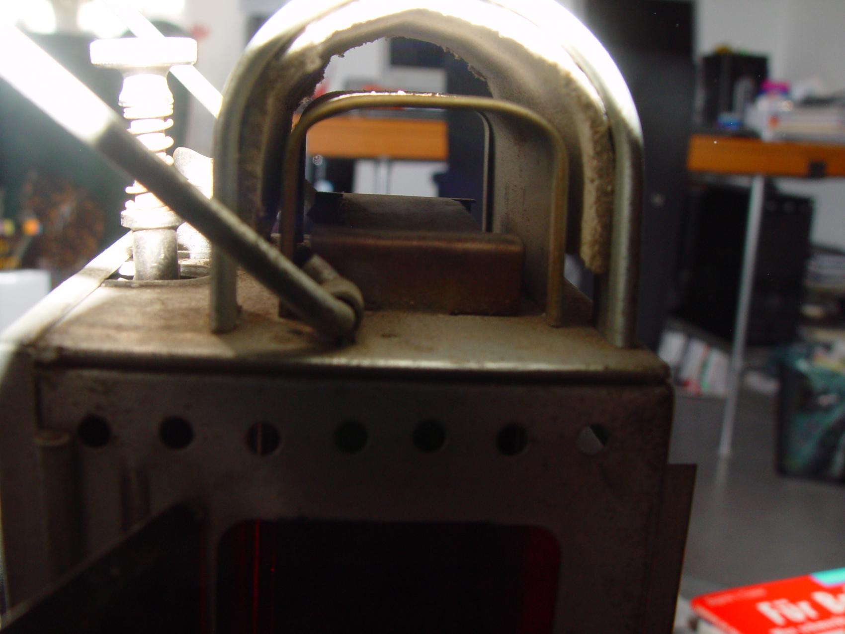Die vordere klare Scheibe kann man, wenn man die oberen Halter etwas aus dem Weg biegt nach oben heraus schieben. So kann man den Brenner warten und Karbid nachfüllen.