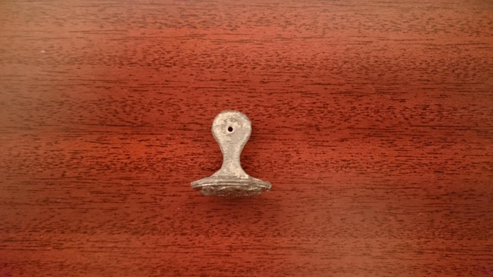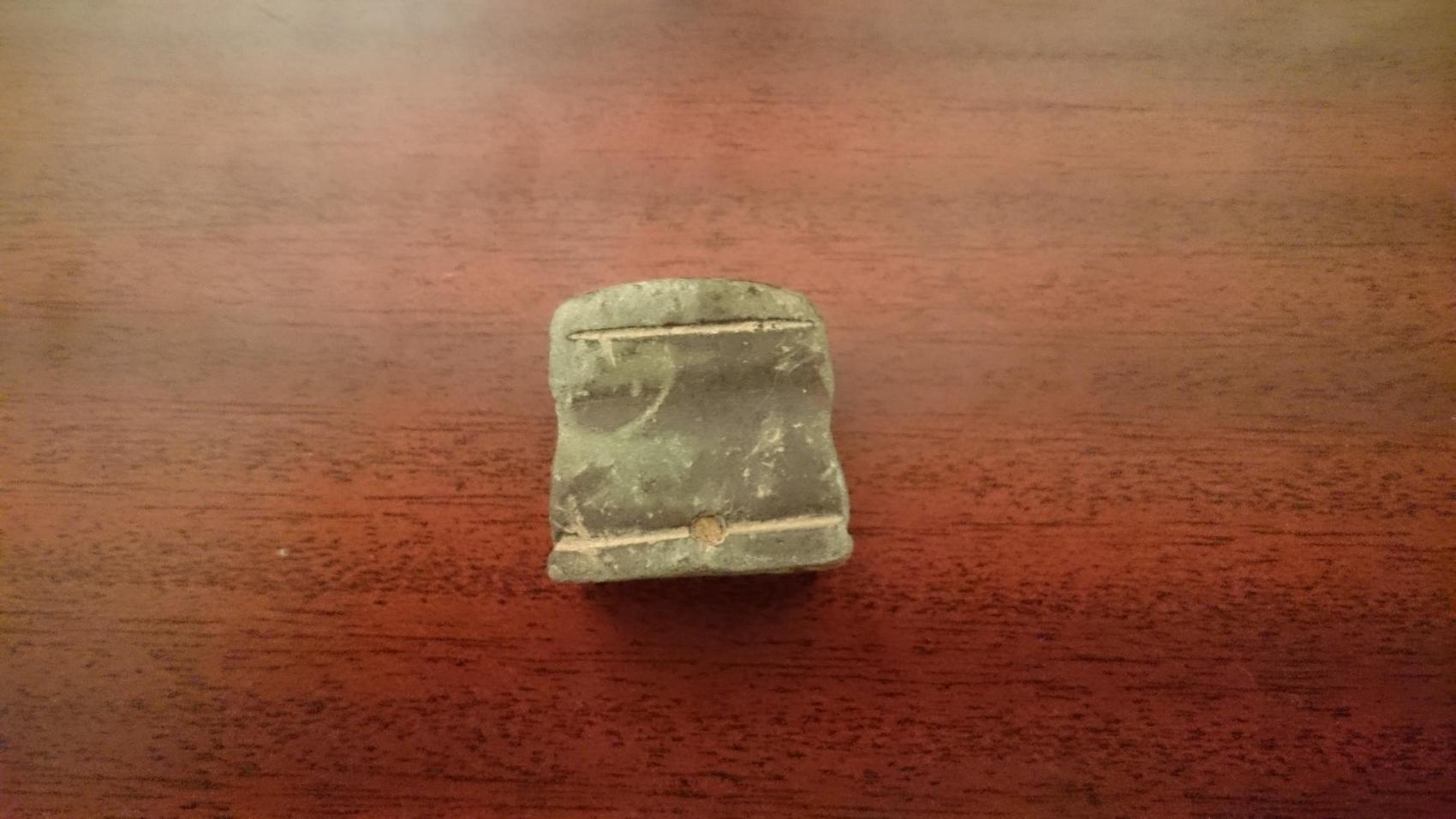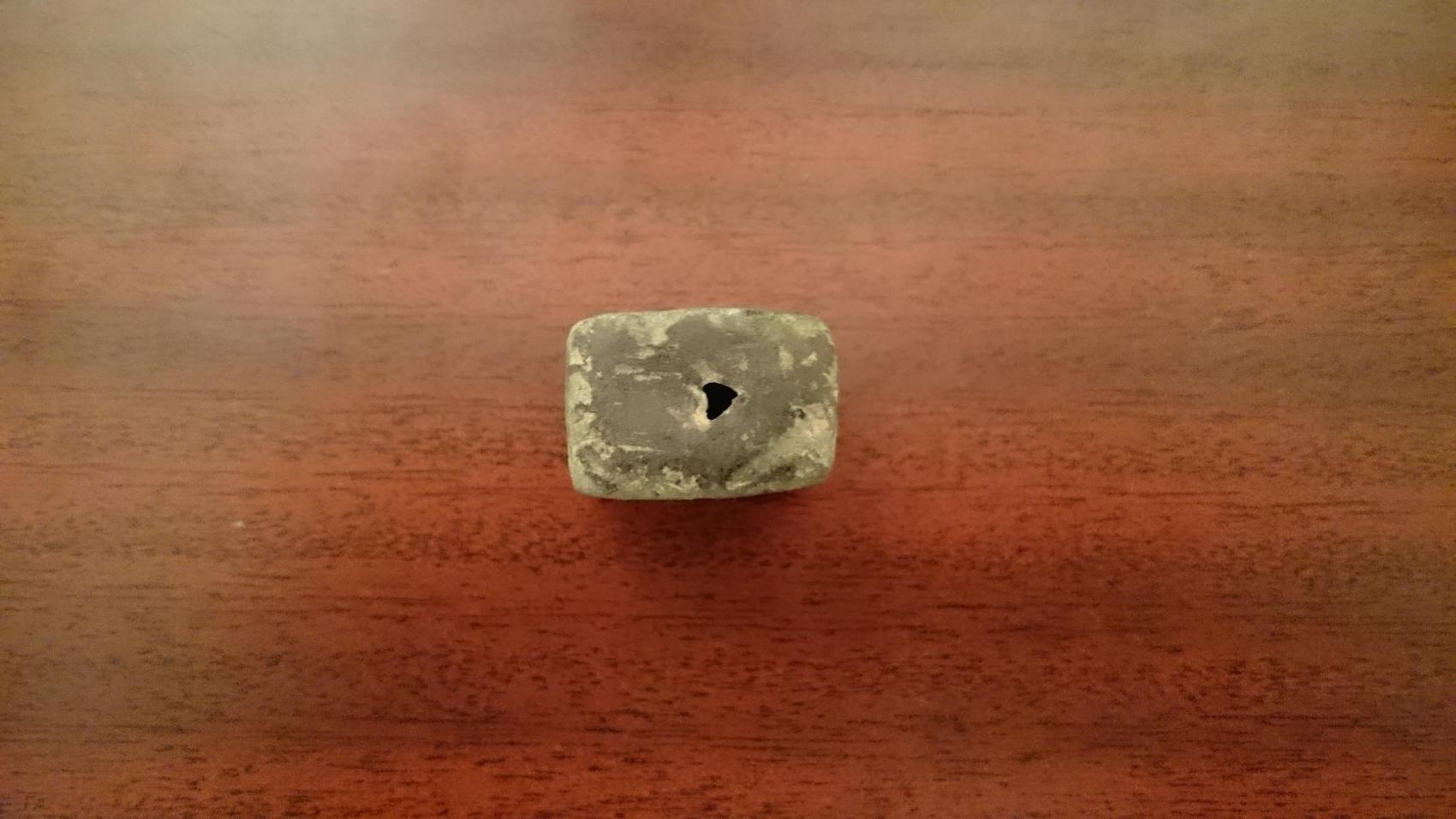Mit Linien und einer "Vertiefung" verziert und oben mittig ein kleines Loch, was aussieht als sei es durch Verschleiß der Oberfläche und das damit verbundene " dünner werden" der Wand entstanden...