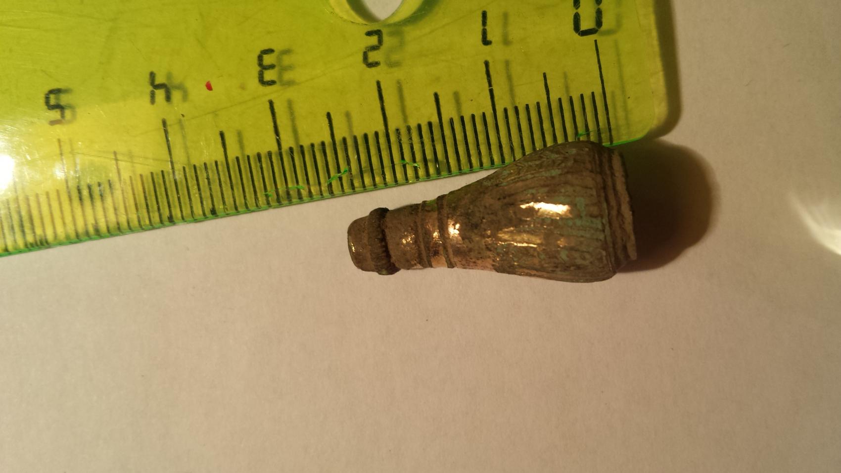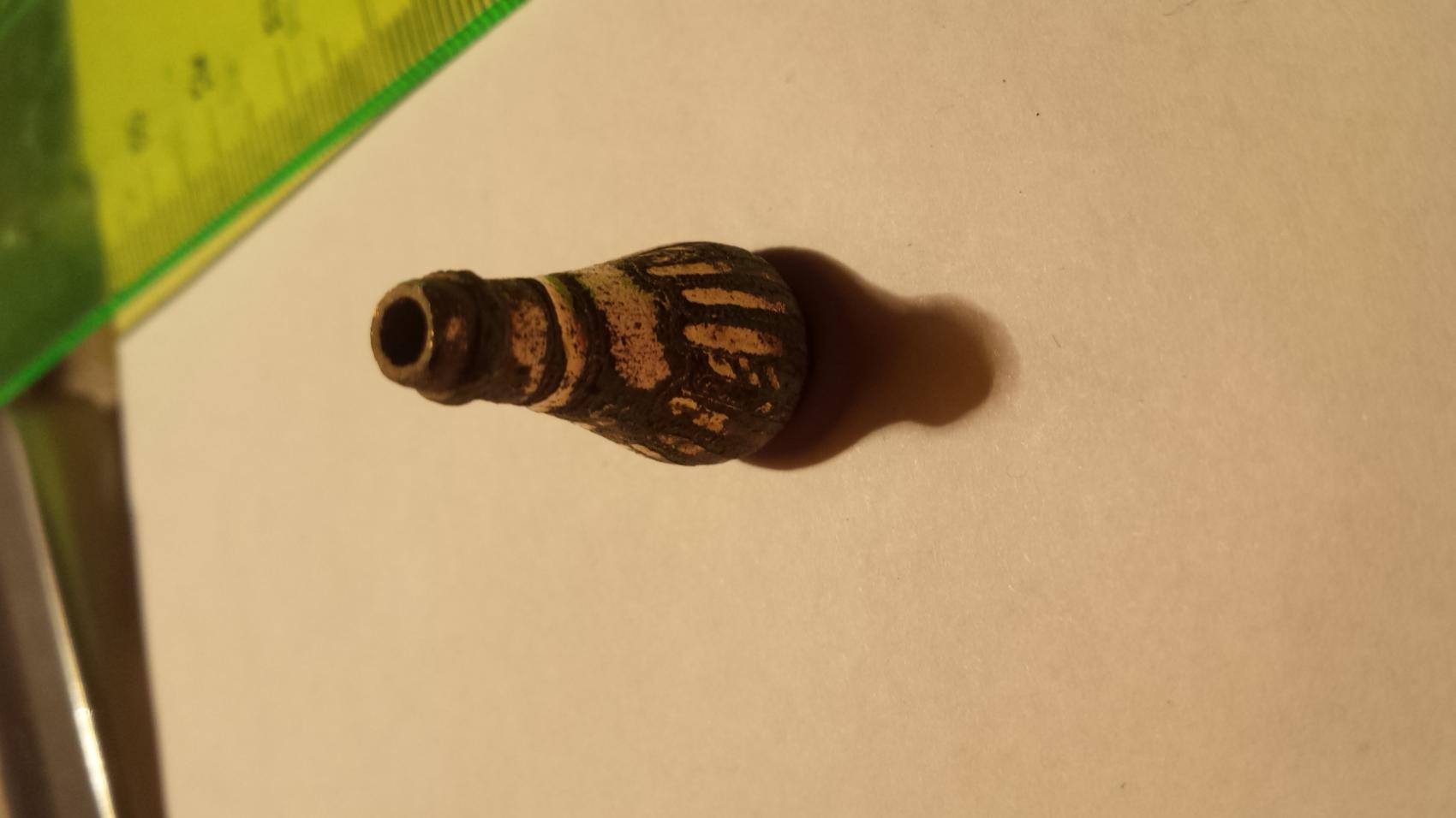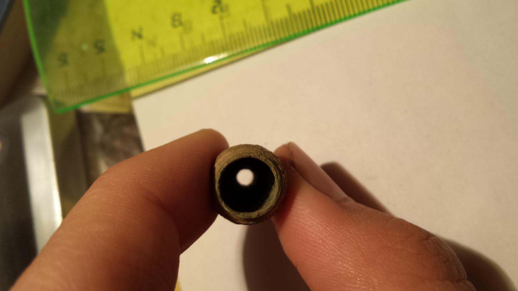 Was is das? Material Kupfer. Von der Patina wird es wohl so 1850 +-40 Jahre sein. Hohl, 2,5 lang und die löcher oben 3mm und unten 9mm