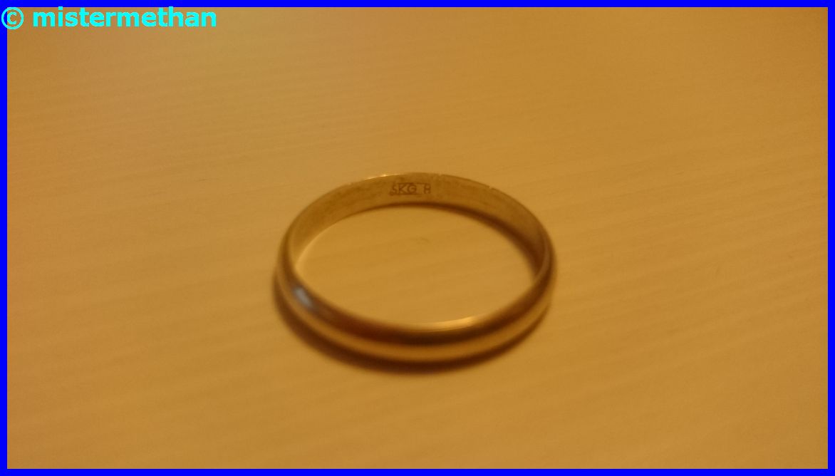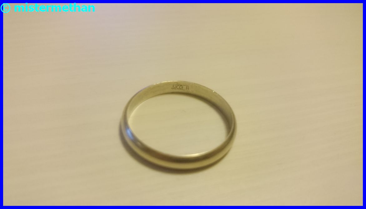 Habe heute dienstlich der Mülltonne etwas Schmuck entnommen, war in einer Holzschatulle. Eigentlich alles Plunder und/oder Modeschmuck. Bis auf diesen Ring hier. War leicht angelaufen, lies sich aber mit Wasser und Küchenrolle abwischen. Er hat was von Gelbgold, ist vermutlich aber nur Ramsch. Die Doubletten aus der Zone ala GSK/GOMA sind mir bestens bekannt, dieser ist aber mit SKG 8 punziert, da finde ich im Gockel leider nüscht außer könnte, evtl. oder vielleicht 8 Karat, blabla...