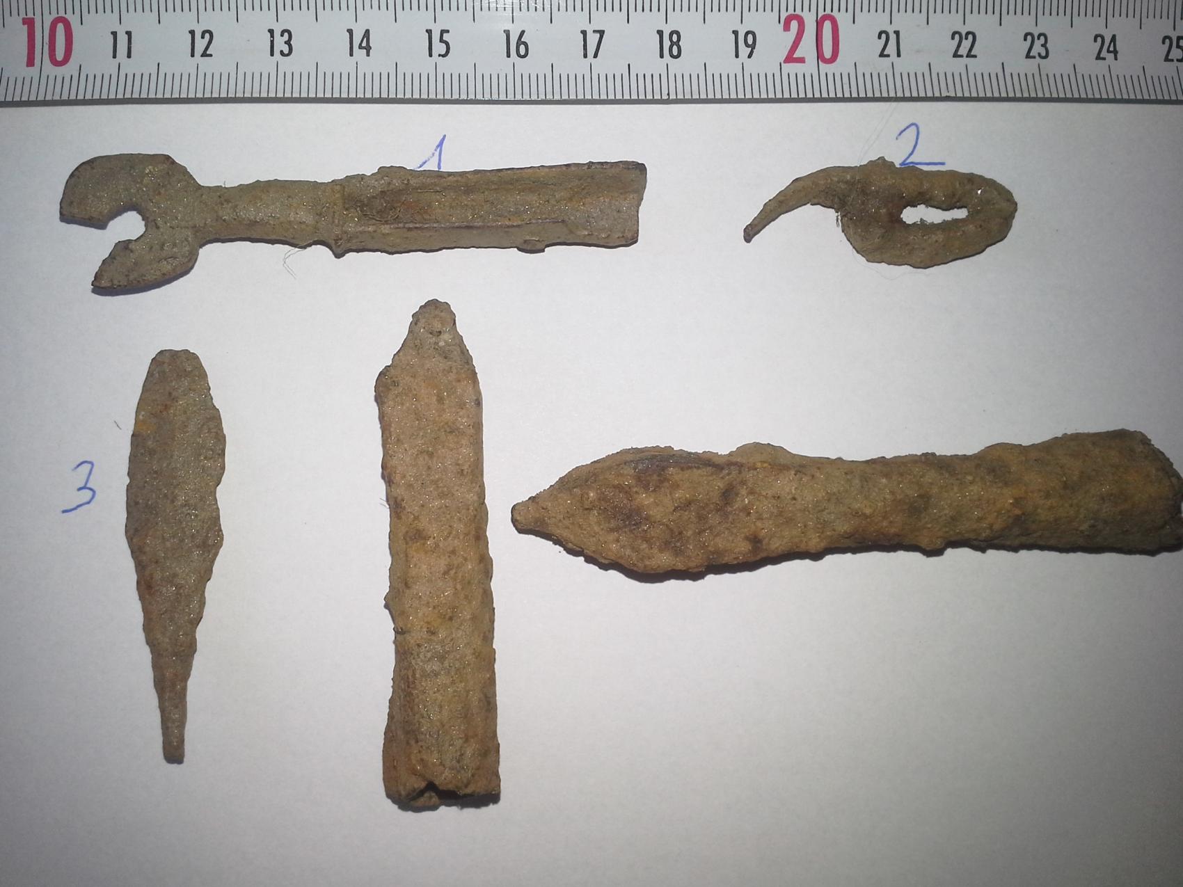 Könnte durchaus alles von einer Armbrust stammen...... Bolzen,Bauteile (Hilfssehnenhalter oder Teil der Visierung)