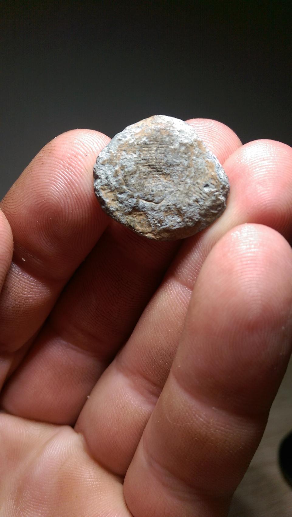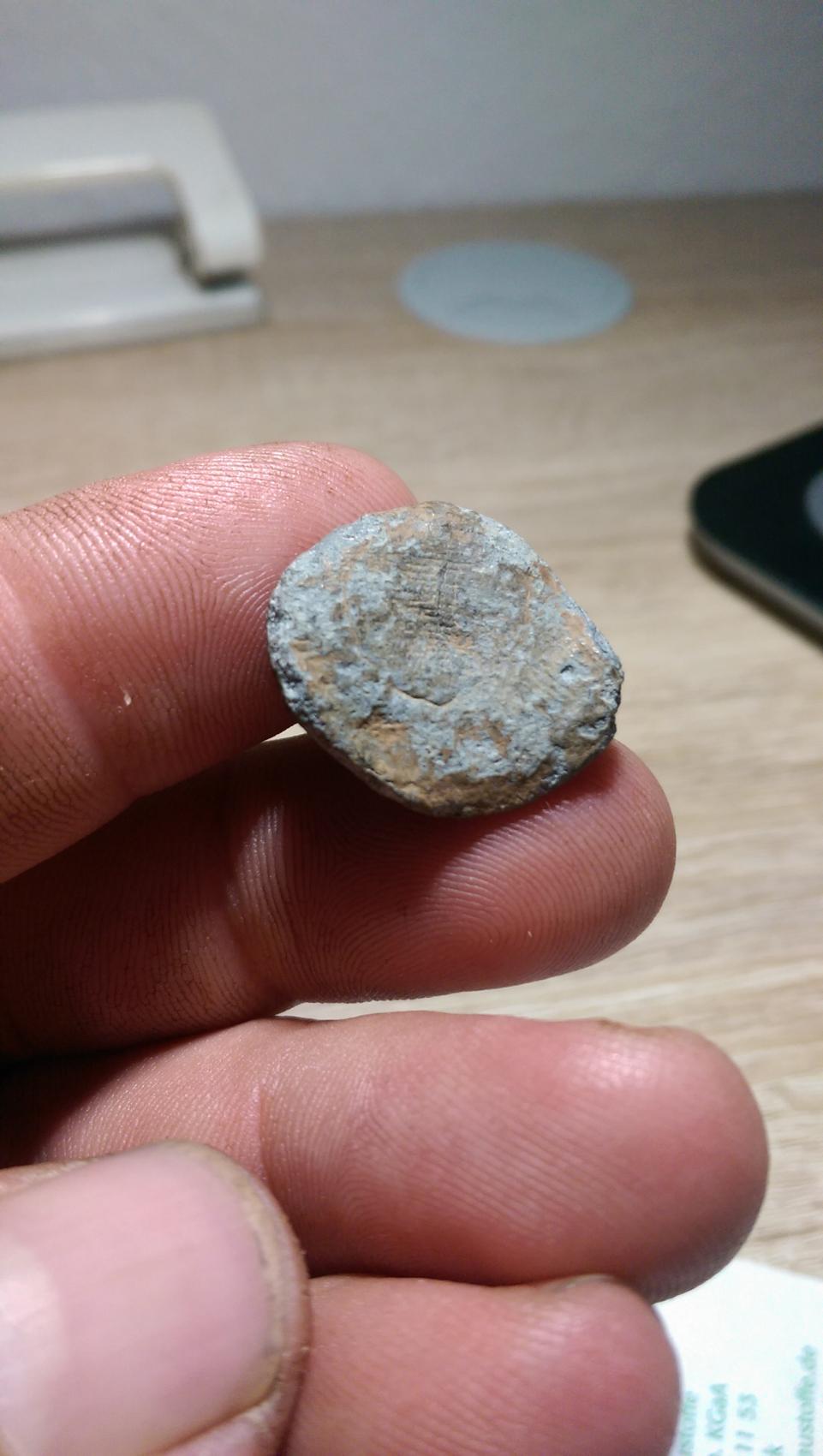 Ich habe letztes Wochenende diesen Fund gemacht, was in dem Waldgebiet auch der einzigste dieses Tages war. Dieser Lag ca. in 20cm tiefe. Hatte erst gedacht das es eventuell eine Musketenkugel ist, die ihr Ziel getroffen hat. Denn habe ich es aber sauber gemacht und da kam denn die "Riffelung" und die "Zahl" oder "Kreuz" in der Mitte zum vorscheinen. Je nachdem wie man es ins Licht hält, sehe ich eine "1" oder ein "Kreuz".