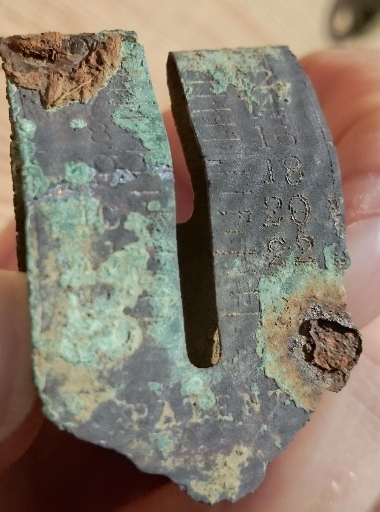 Und das umgeknickteTeil scheint eine Messlehre o.ä. zu sein links und rechts eine Scala bis 24 unten steht "PATENT" oben u.a. "Kilo"