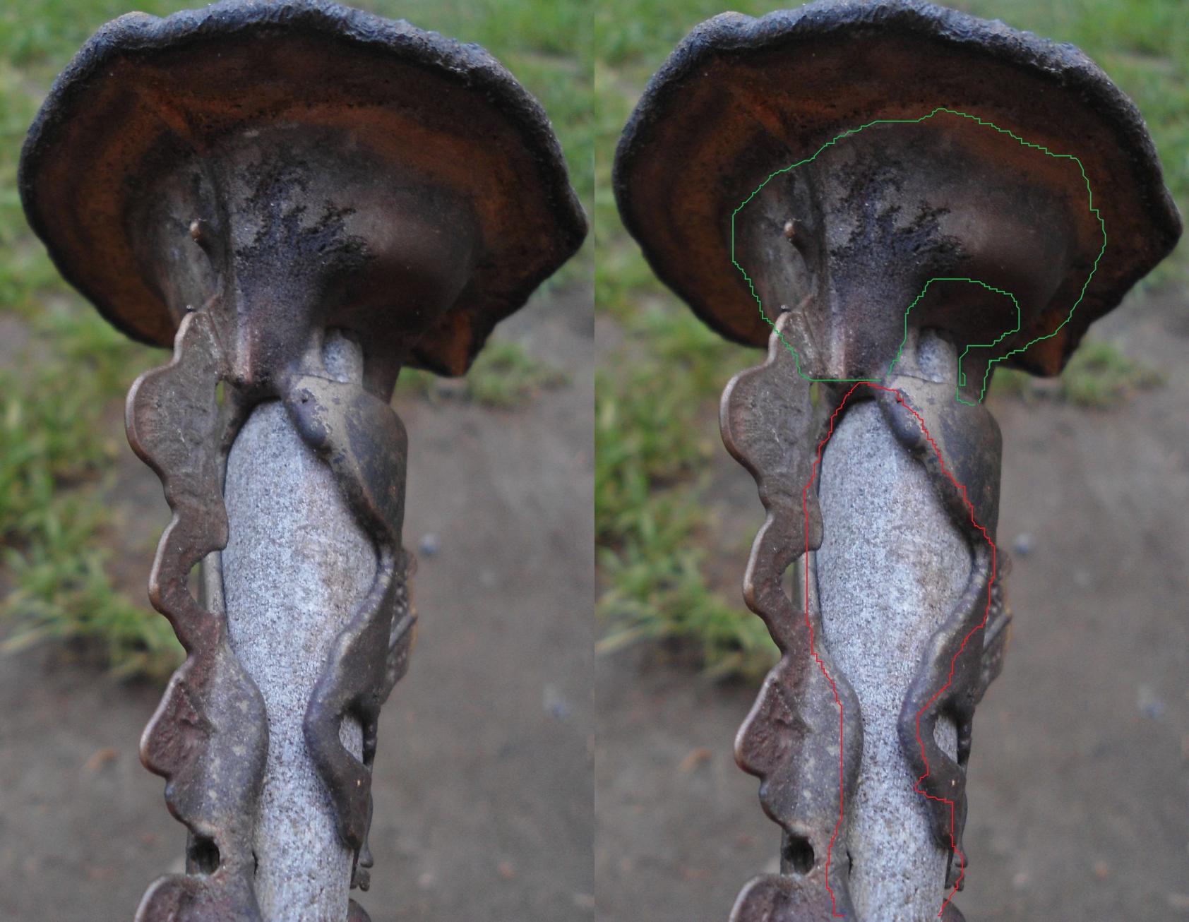 Treffer auf harten Gegenständen sollten die Spitze verbiegen, bei Bronzespitzen etwa das erste Drittel. Ein "Streifschuss" der Tülle an einem harten Gegenstand halte ich für ausgeschlossen, es müsste schon ein verdammt hefiger Schlag sein, der die Bronze direkt zum Brechen bringt. Eine zum Bruch führende Verformung muss c.q. die ganze Tülle quetschen und davon ist am Rest nichts zu sehen.
