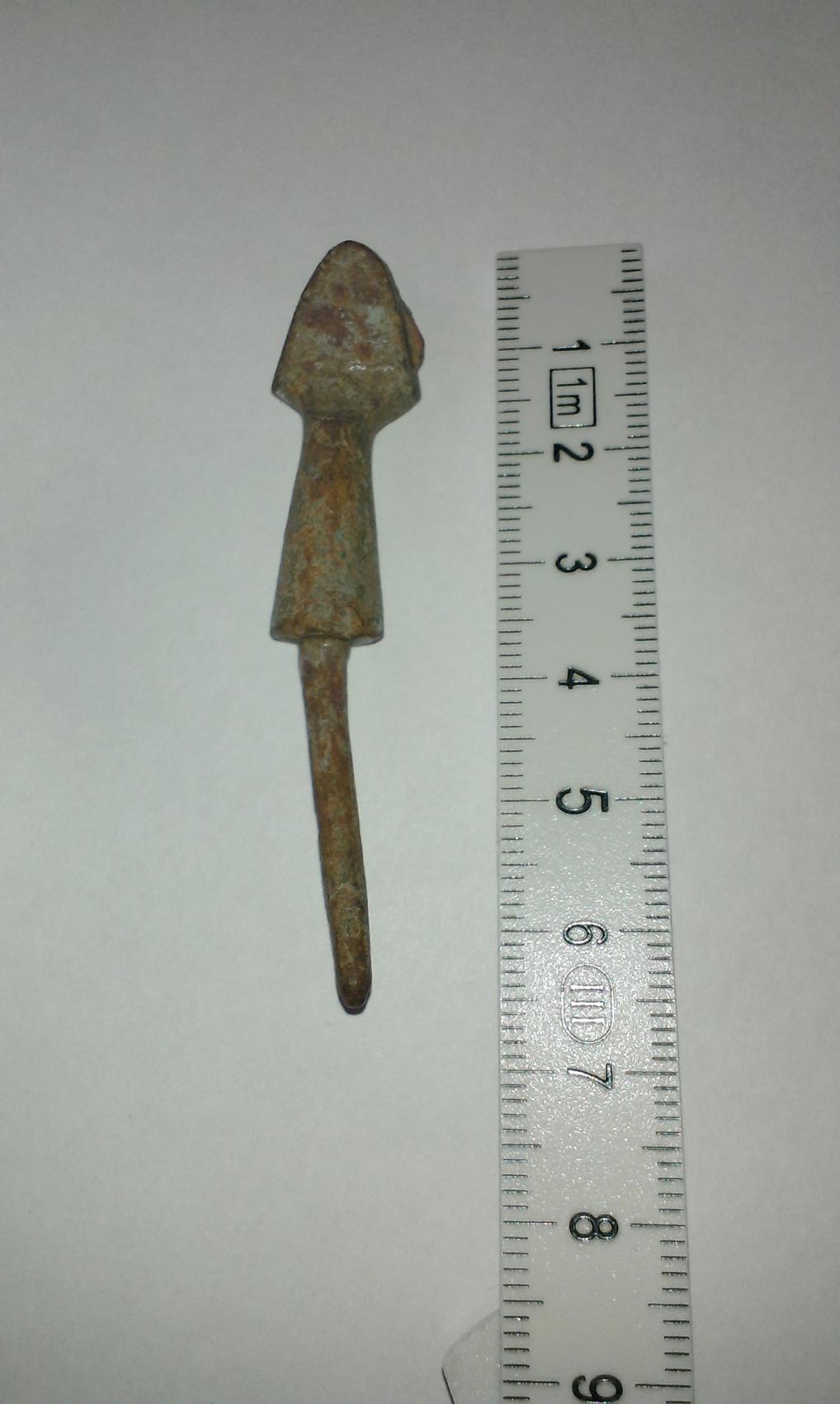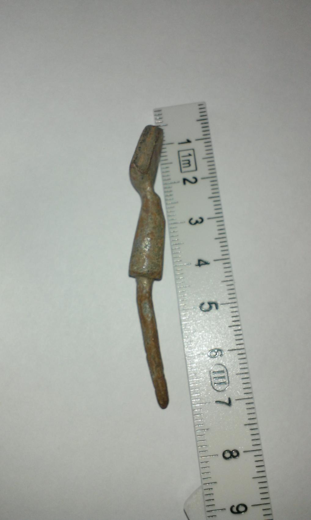 Zwischen den beiden Spitzen sieht es so aus als ob eine gummiartige Membran eingeklemmt war. Kleine Teile stehen noch an der Seite raus.Die original Farben kommen auf Bild 3 und 4 am besten raus.Material scheint eine Kupferlegierung zu sein mit abgeriebenen versilberungen. Ich denke an ein Maschinenteil.