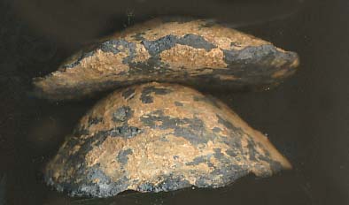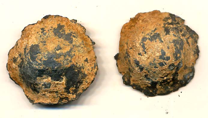 Kein Sandeinschluß wie bei in den Boden geschossenen Kugeln, ausgefranster Rand, flacher Boden, 18,16 und 18,31 Gramm schwer, spez. Gewicht knapp unter Blei. 2,5 cm breit, 0,7 und 0,9 cm dick.