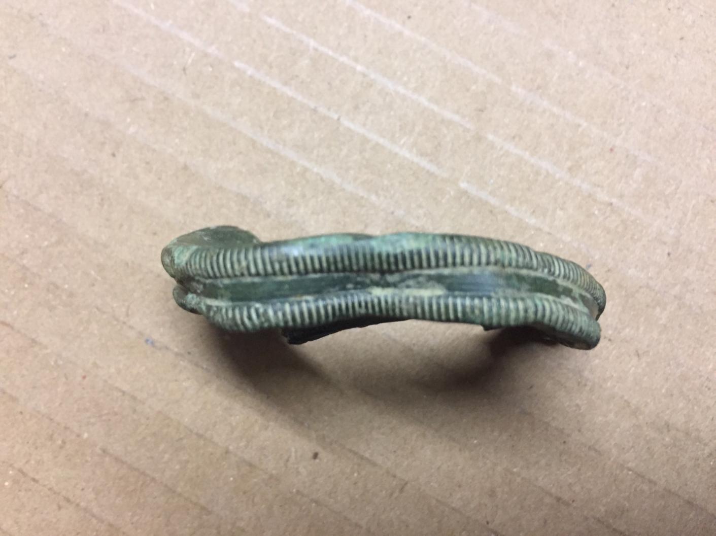 ich habe hier augenscheinlich einen deformierten Deckel. Von der Machart wie ein gewöhnlicher Schraubverschlussdeckel. Ich kenne diese Dinger allerdings nur aus Weißblech. Das Material ist schön grün angelaufen, wie Bronze. Zudem scheint es sehr spröde zu sein und ungewöhnlich dick. Bis zu 3mm an manchen Stellen. Ich habe keine blassen Schimmer was das sein könnte...?!