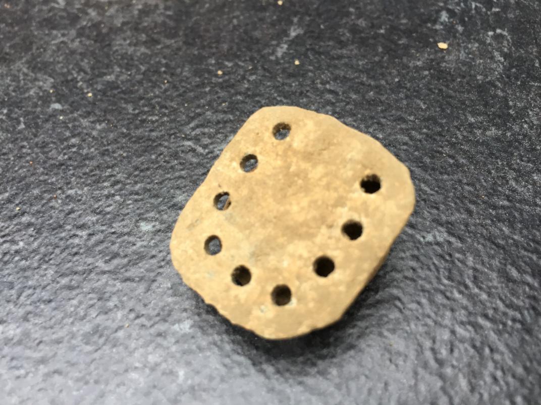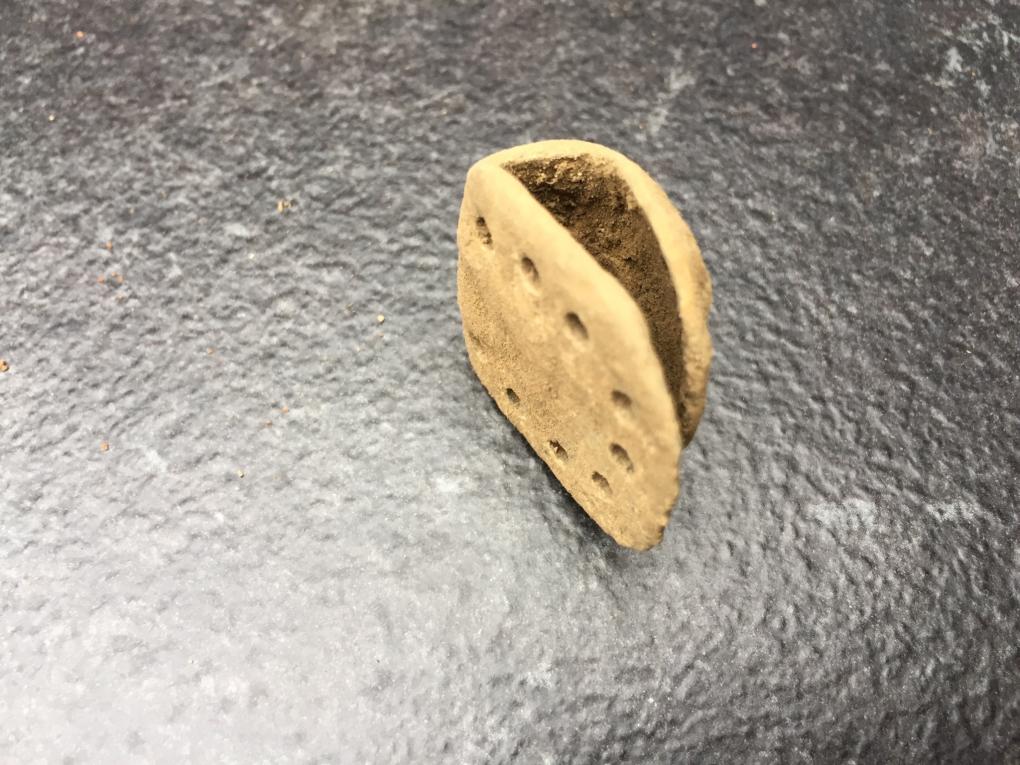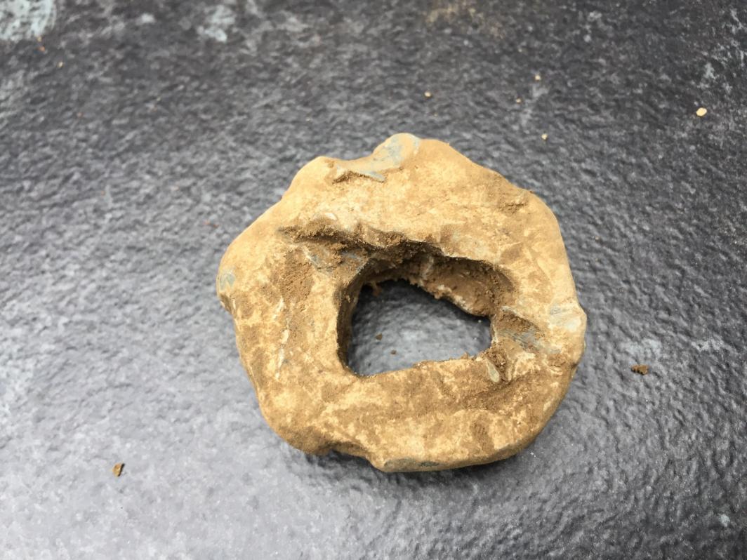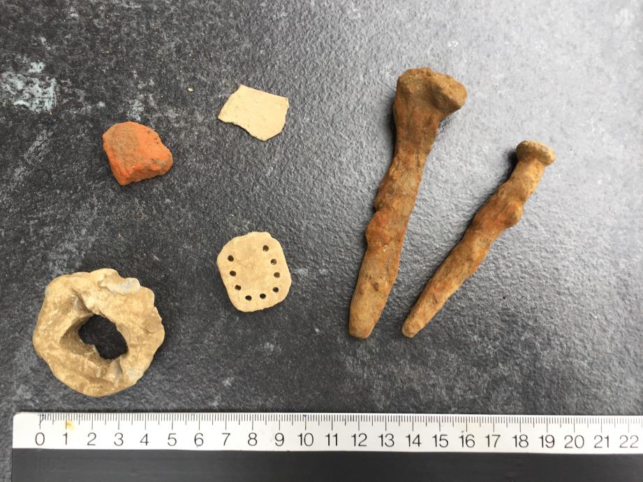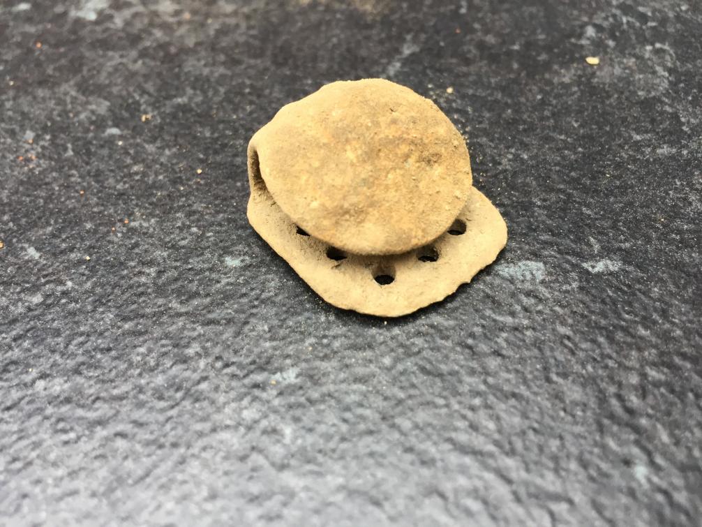 ich habe heut eine art Spange gefunden. Kann mir allerdings nicht erklären was das sein soll. Dazu habe ich noch einige Beifunde machen können, wie dieser massive Bleiring, erinnert mich an einen germanischen Gusszapfen. Dann noch diese beiden dicken Nägel und ein kleines Stück Kupfer. Das alles lag in unmittelbarer Nähe zueinander. Und zwischendurch immer wieder Stücke von gebrannten Ziegelstein, welcher sehr weich ist. Was könnte das für eine Spange sein?