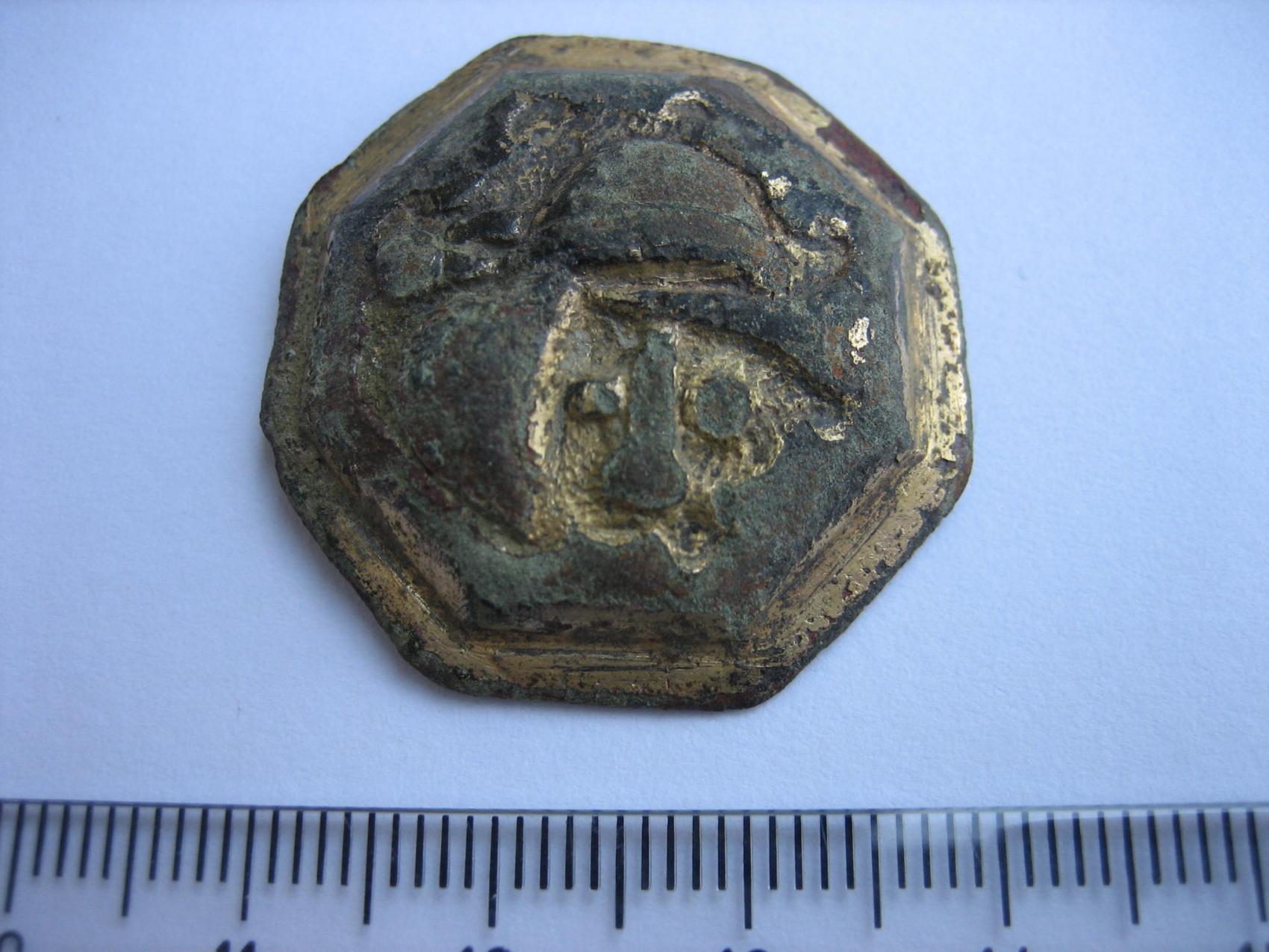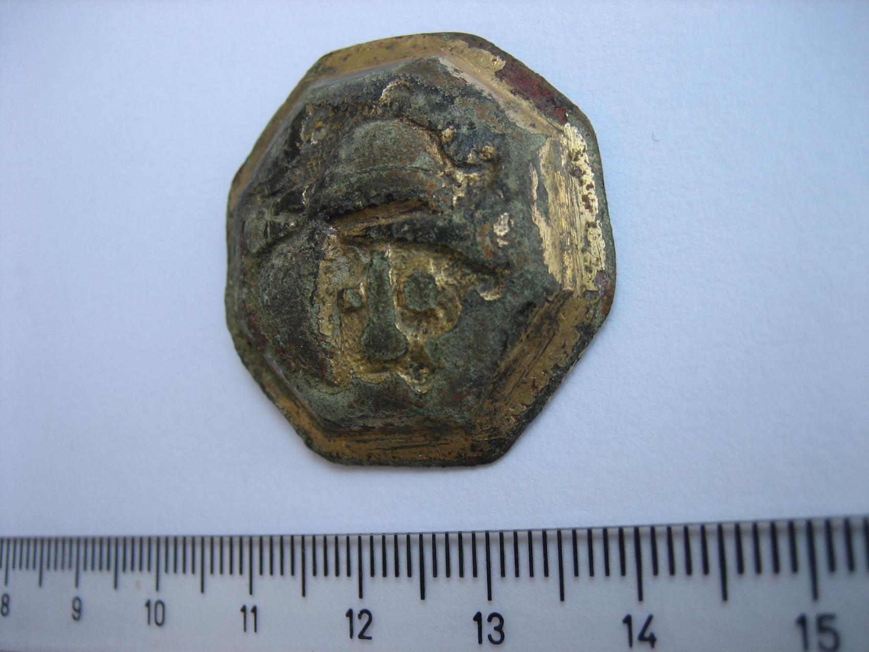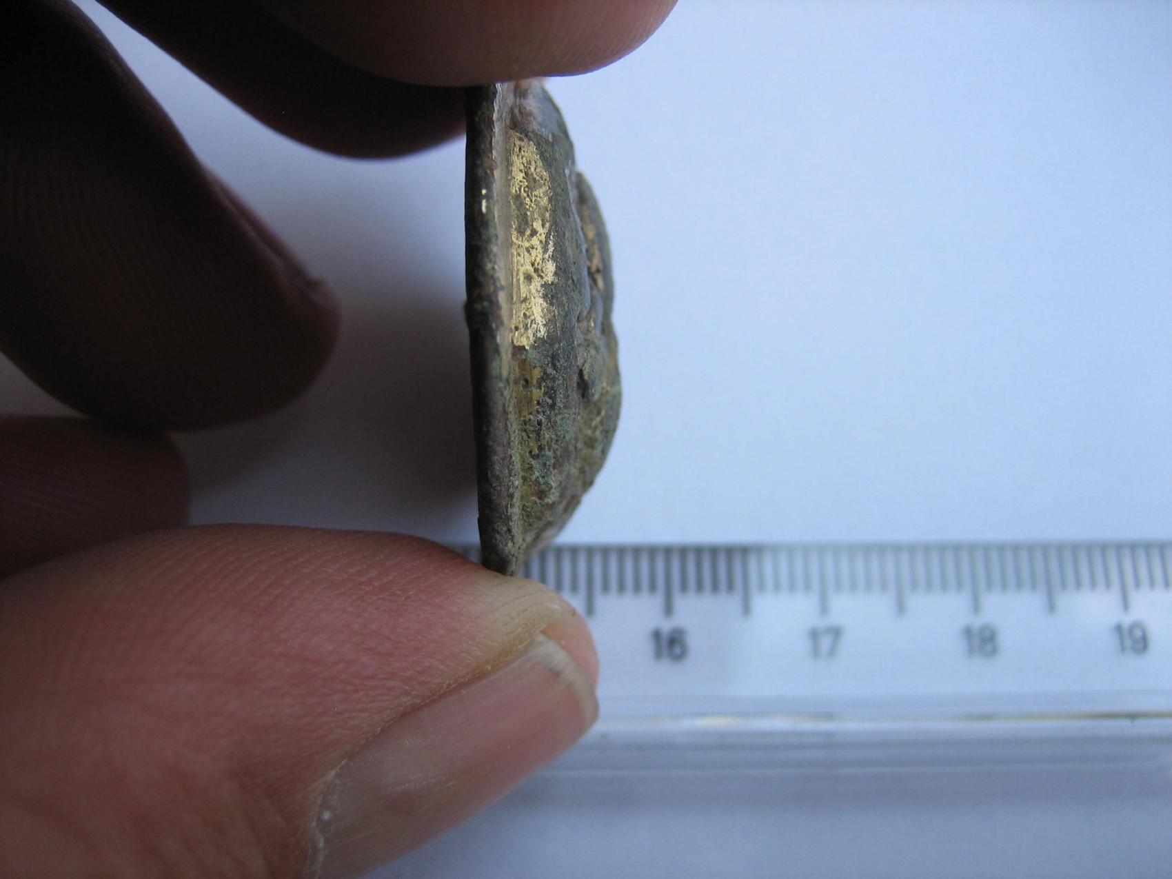 Von der Machart würde ich auf 700 bis 900 n. Chr. tendieren. wegen dieser wenn auch "fratzenhafter" Darstellung(Gesicht mit Helm) bin ich auf soetwas wie Heiligenfibeln/ Scheibenfibeln gestoßen, allerdings irritiert mich die Befestigungsmöglichkeit auf der Rückseite ein wenig.